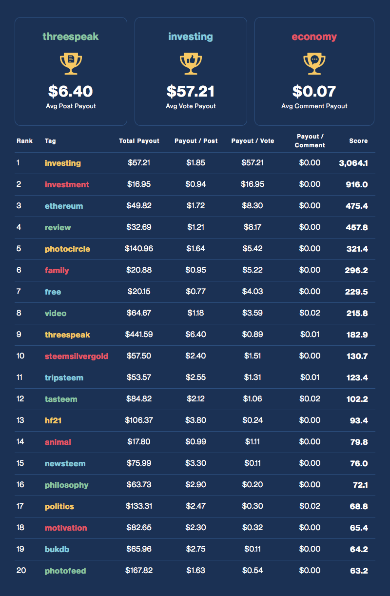 Each day we award and rank the top performing tags across the Steem ecosystem in terms of financial opportunity. Find which tags are your best opportunity to make rewards!