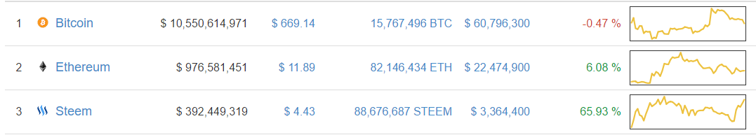 Compare the capitalization of Steem with the capitalization of both BTC and ETH.