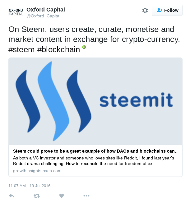 Exford Capital writes article on STEEM and tweets about it! This will give attention from Venture Capitalists!
