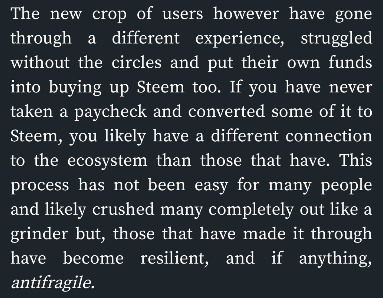 The new crop of users however have gone through a different experience, struggled without the circles and put their own funds into buying up Steem too. If you have never taken a paycheck and converted some of it to Steem, you likely have a different connection to the ecosystem than those that have. This process has not been easy for many people and likely crushed many completely out like a grinder but, those that have made it through have become resilient, and if anything, antifragile.