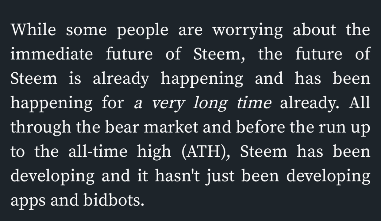 While some people are worrying about the immediate future of Steem, the future of Steem is already happening and has been happening for a very long time already. All through the bear market and before the run up to the all-time high (ATH), Steem has been developing and it hasn't just been developing apps and bidbots.