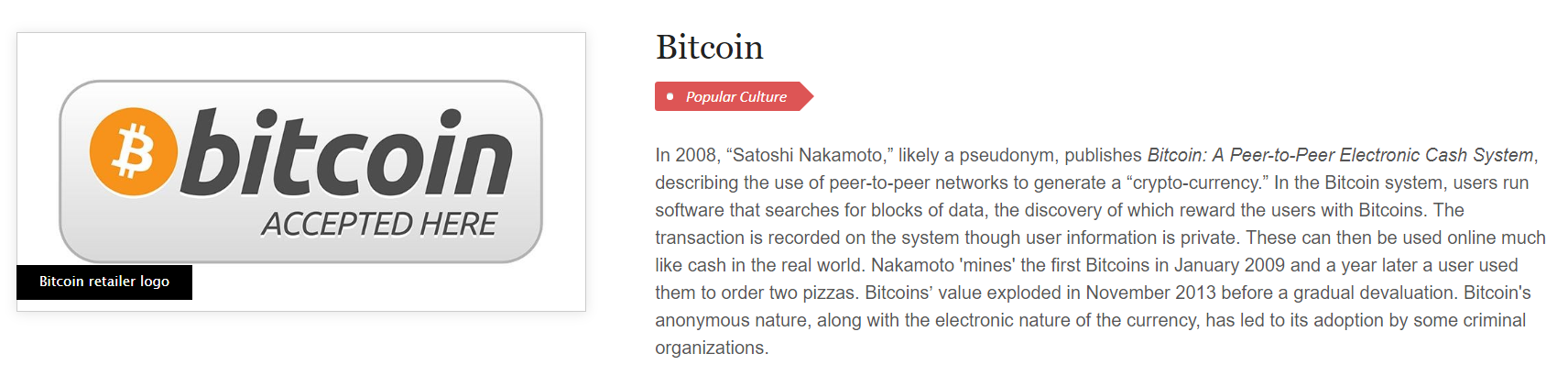 In 2008, “Satoshi Nakamoto,” likely a pseudonym, publishes Bitcoin: A Peer-to-Peer Electronic Cash System, describing the use of peer-to-peer networks to generate a “crypto-currency.” In the Bitcoin system, users run software that searches for blocks of data, the discovery of which reward the users with Bitcoins. The transaction is recorded on the system though user information is private. These can then be used online much like cash in the real world. Nakamoto 'mines' the first Bitcoins in January 2009 and a year later a user used them to order two pizzas. Bitcoins’ value exploded in November 2013 before a gradual devaluation. Bitcoin's anonymous nature, along with the electronic nature of the currency, has led to its adoption by some criminal organizations.
