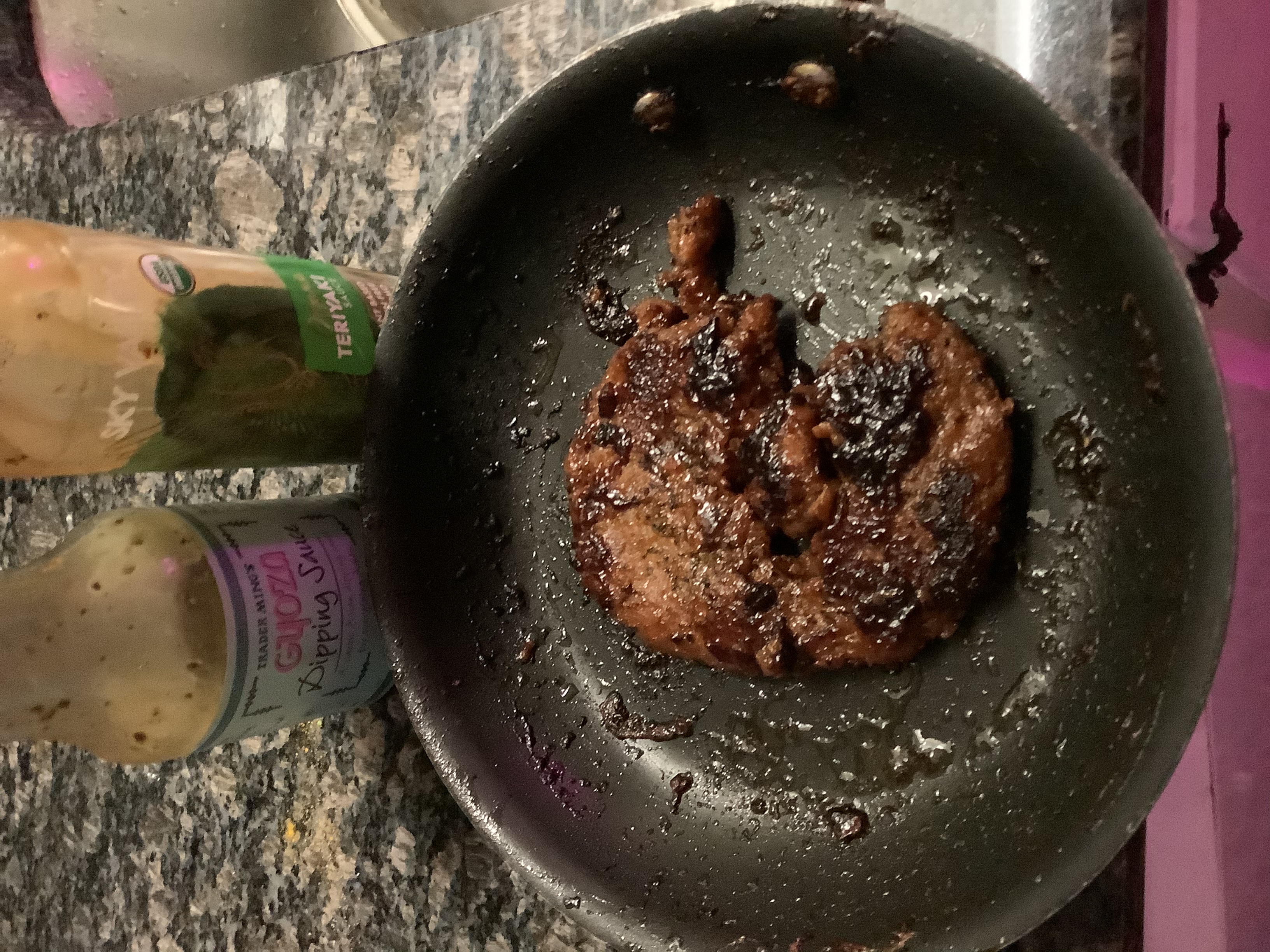 I also marinated a Beyond Beef brand plant based burger in Teriyaki and gyoza dipping sauce from Trader Joes and pan seared on high heats to carmalize the sauces onto the burger- the burger was also seasoned with pink salt, fresh ground black pepper, turmeric, and Cayenne pepper - these are my go to combo for both health and flavor reasons. the burger fell apart a bit but it ended up be scrumdillyicious!
