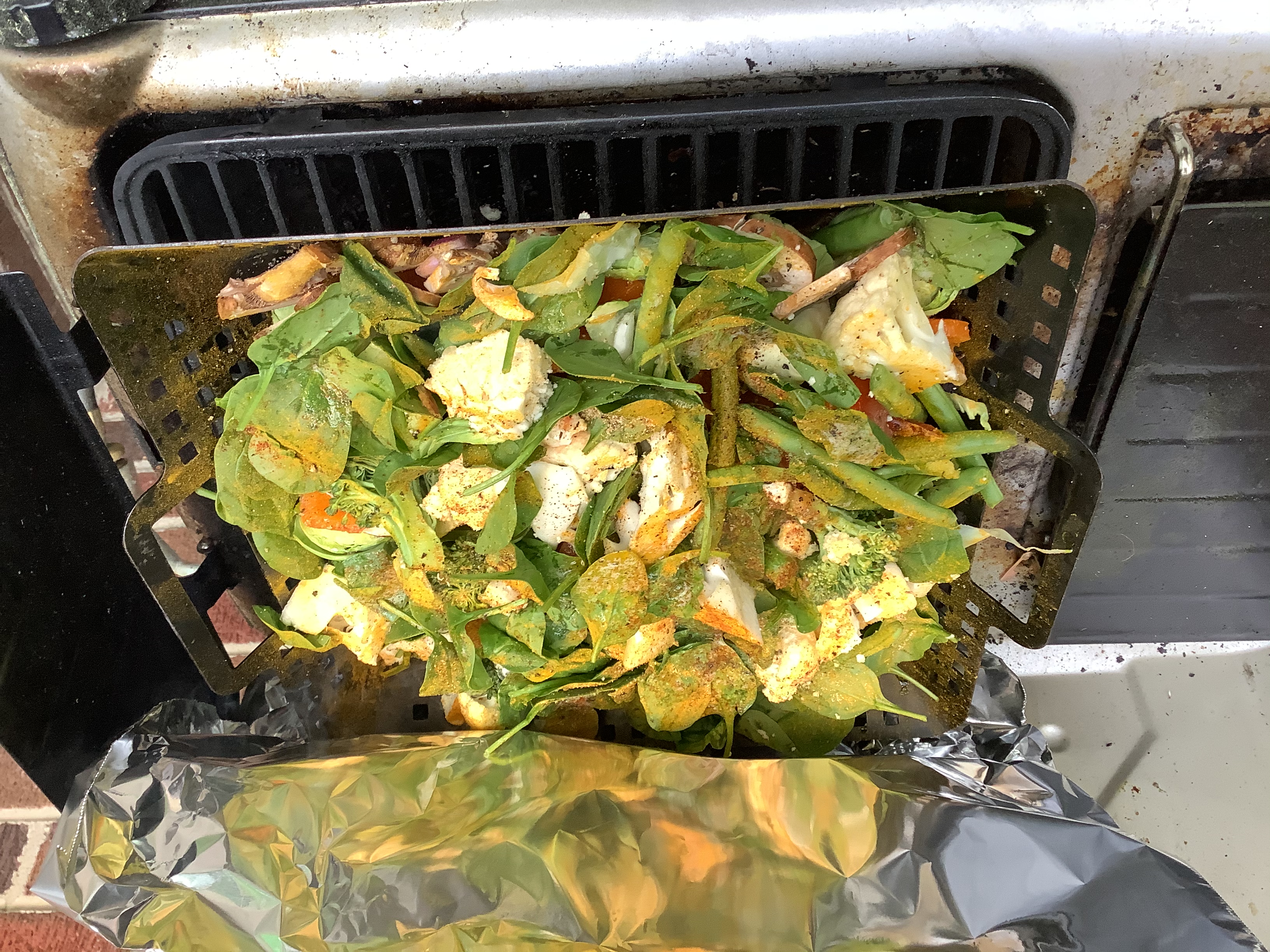 Place tossed seasoned veggie mix in a grilling cage and grill on medium heat for 20 minutes- you def want the veggies to still taste crispy while having some nice searing marks on some peices. Place foilover the cage to retain heat and smoke.