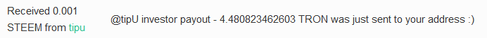 With every TRON payout, user will also receive 0.001 STEEM with payout confirmation: