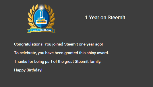 На днях @steemitboard поздравил меня с годовщиной регистрации в Steem. Теперь у меня тоже есть такая красивая ачивка...
