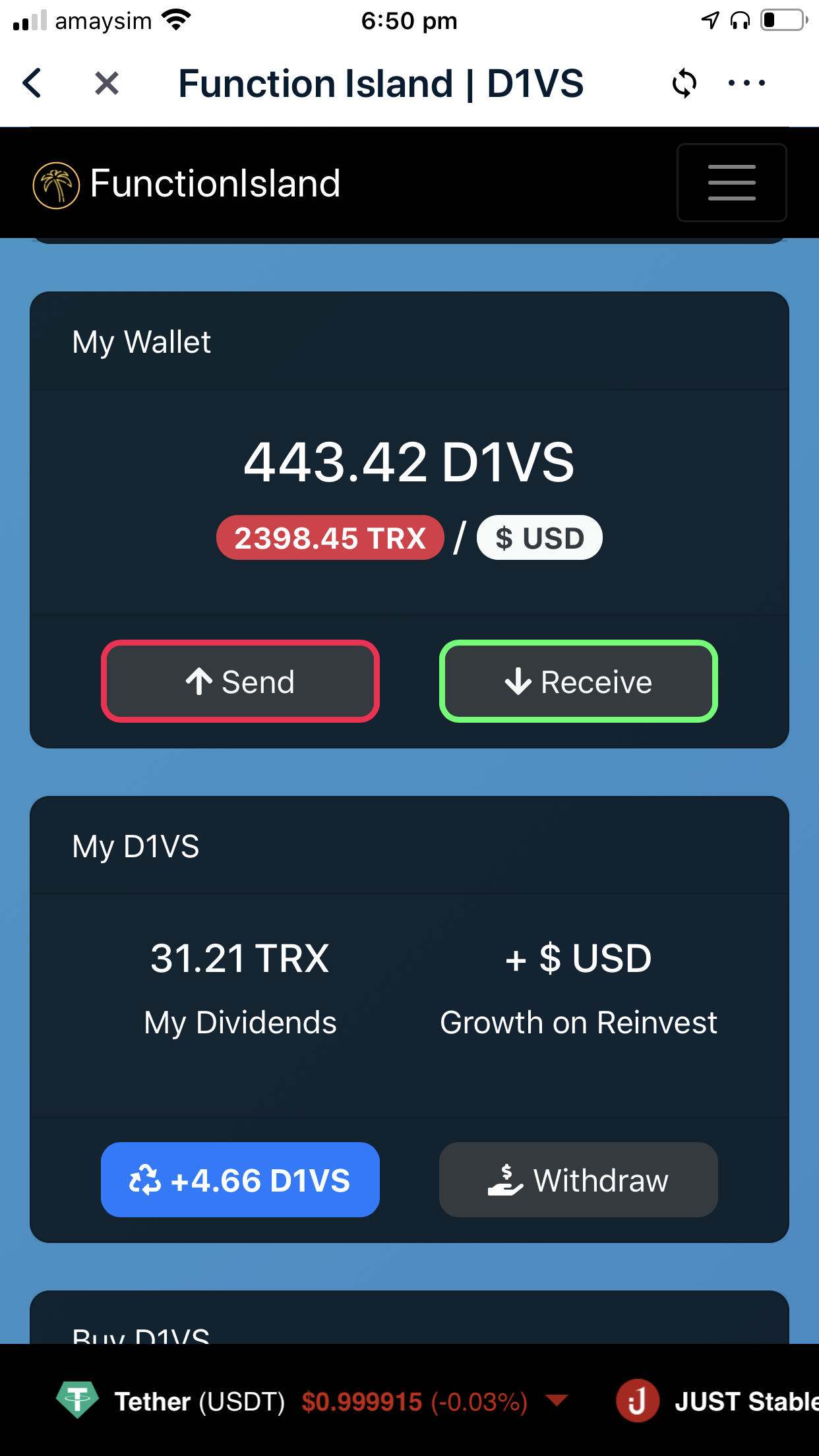 Dividends are distributed to the Holders in the form of TRX and there is also a 3% Referral Commission as an appreciation gesture to supporters of Function Island. We can also Send/Receive D1VS to different TRX wallet addresses.