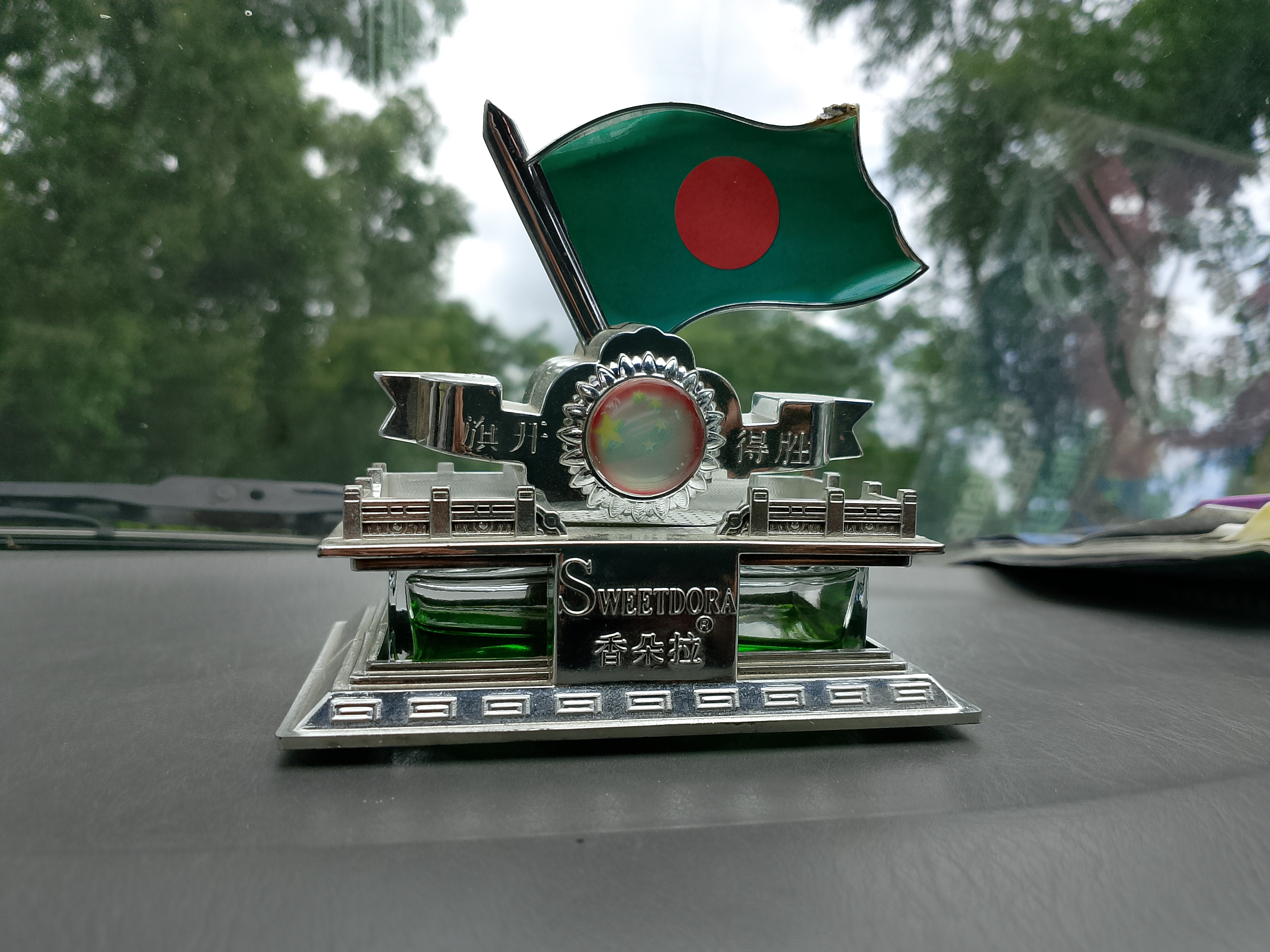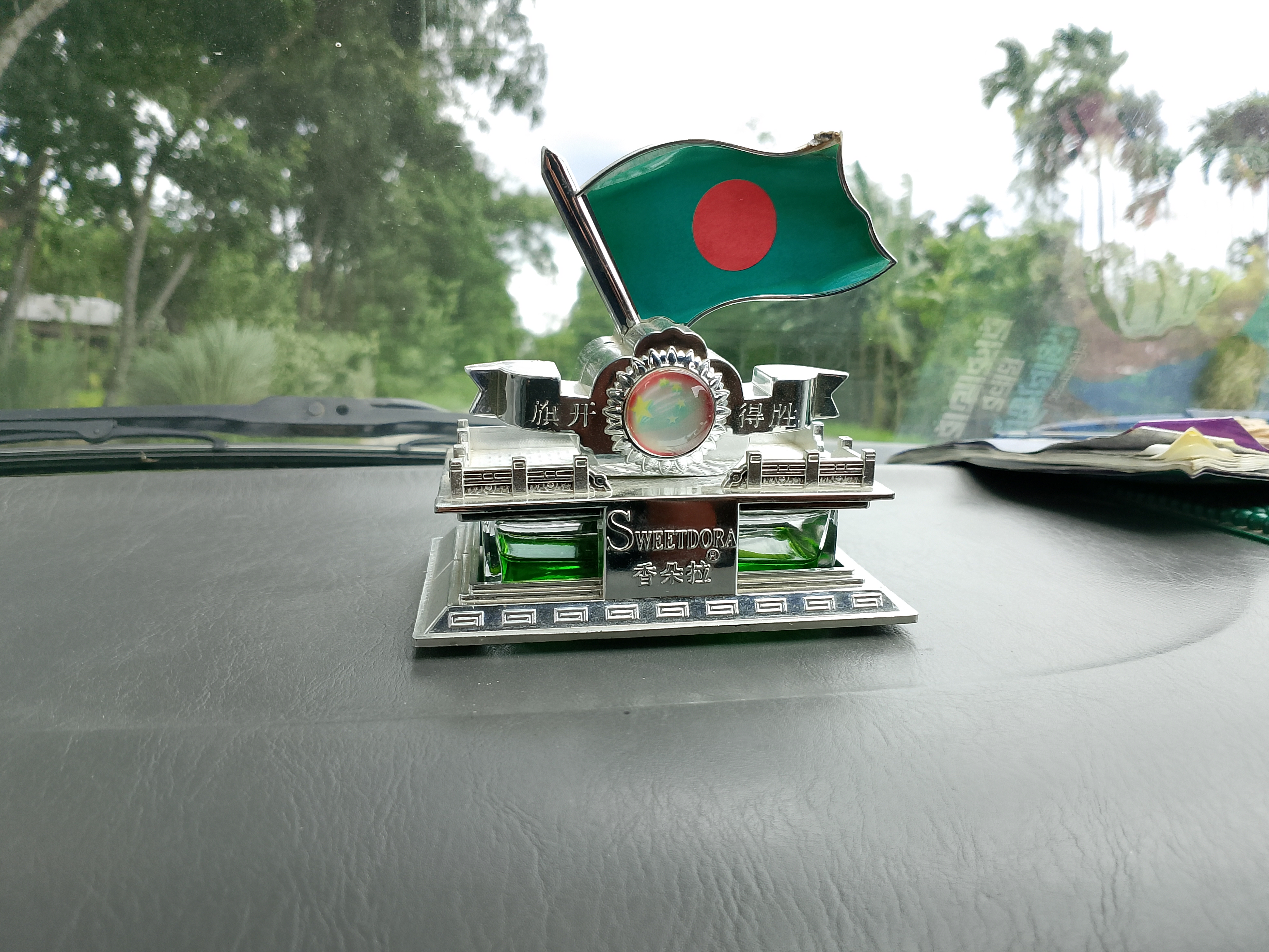 The showpiece of my country's flag — this small red and green flag — has been placed inside a showpiece that looks like a beautiful little house. The flag has been beautifully displayed on top of it. This is only for decoration, and it is placed in the front of the car. Many beautiful office-style decorations can be seen, but this showpiece is a bit different. Here, our national flag is included, which looked quite nice.