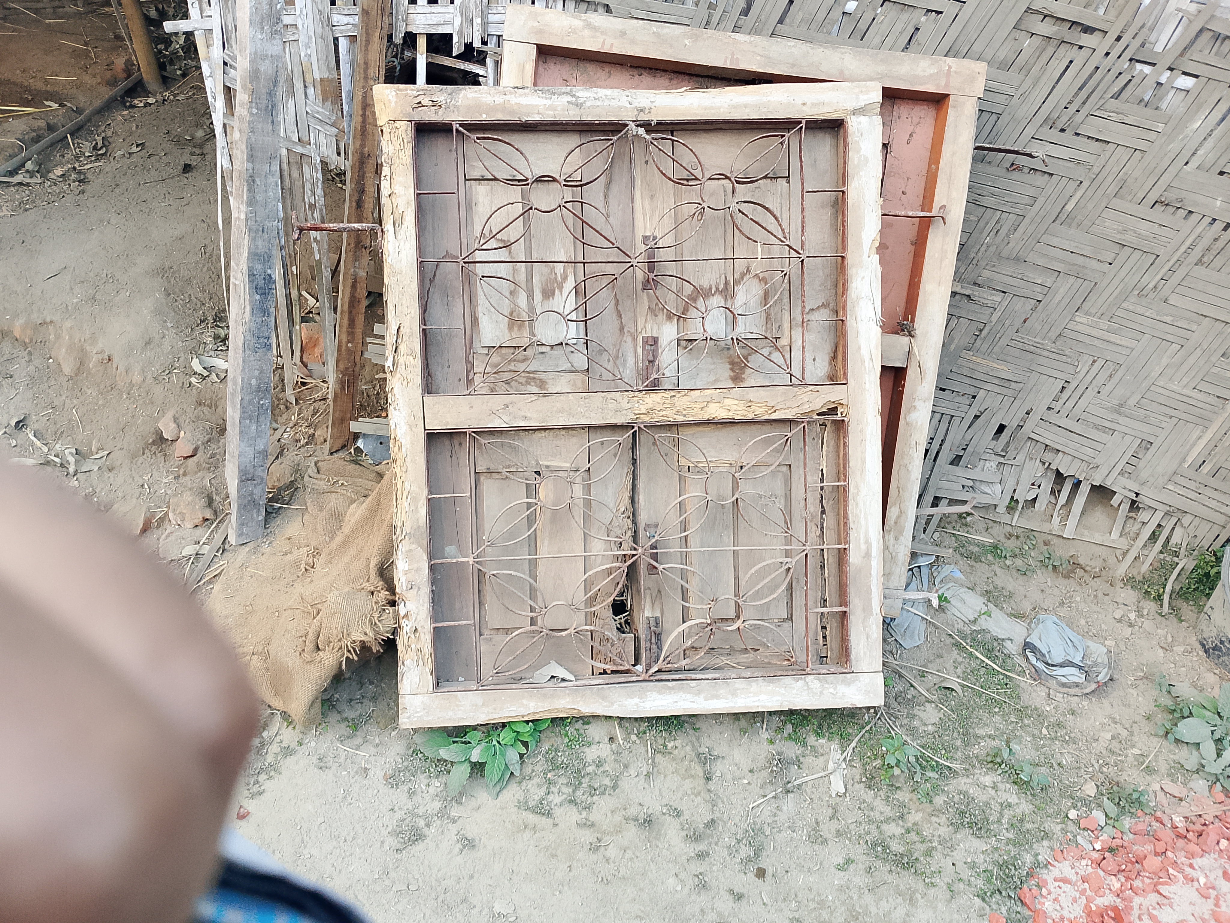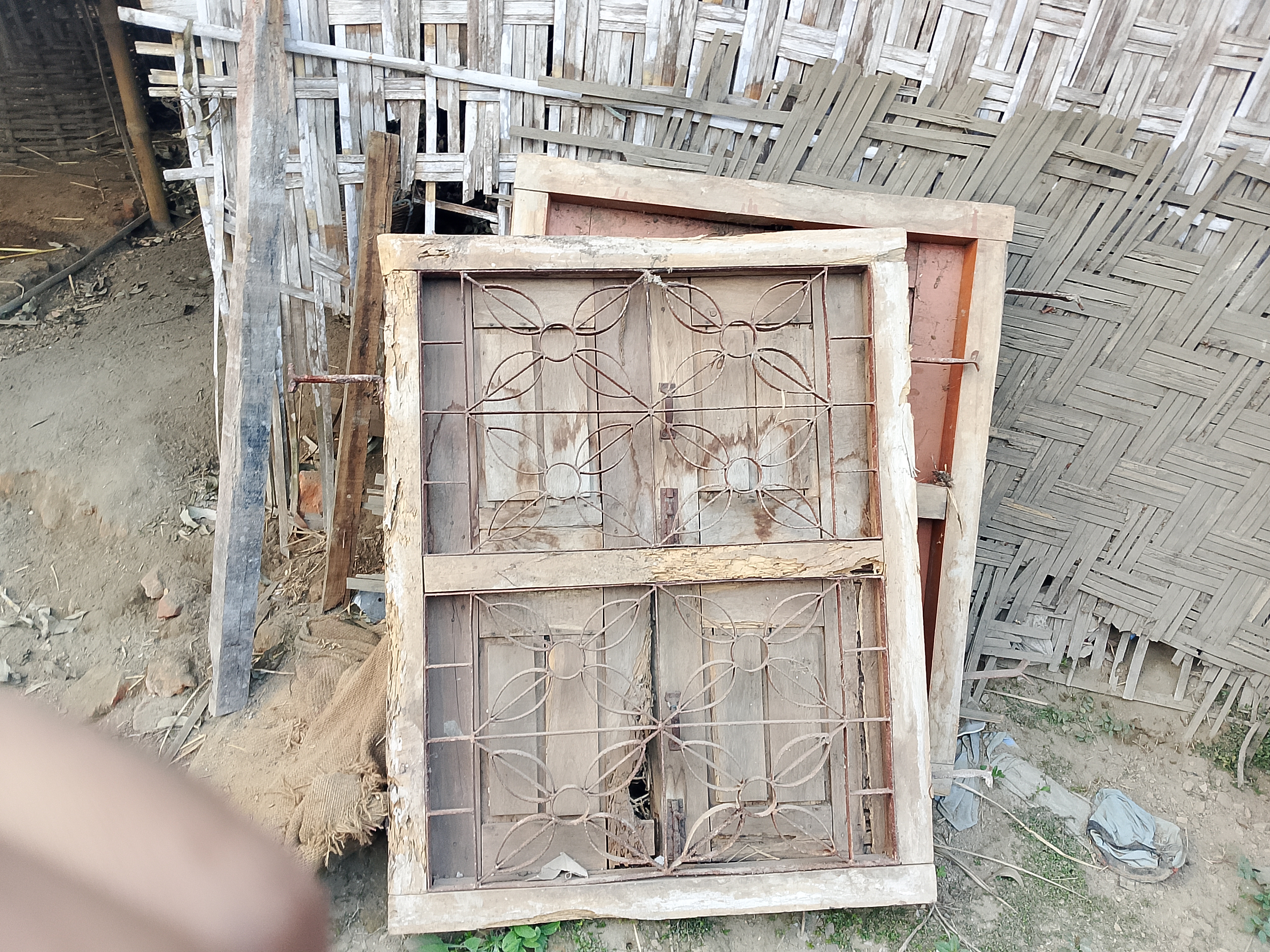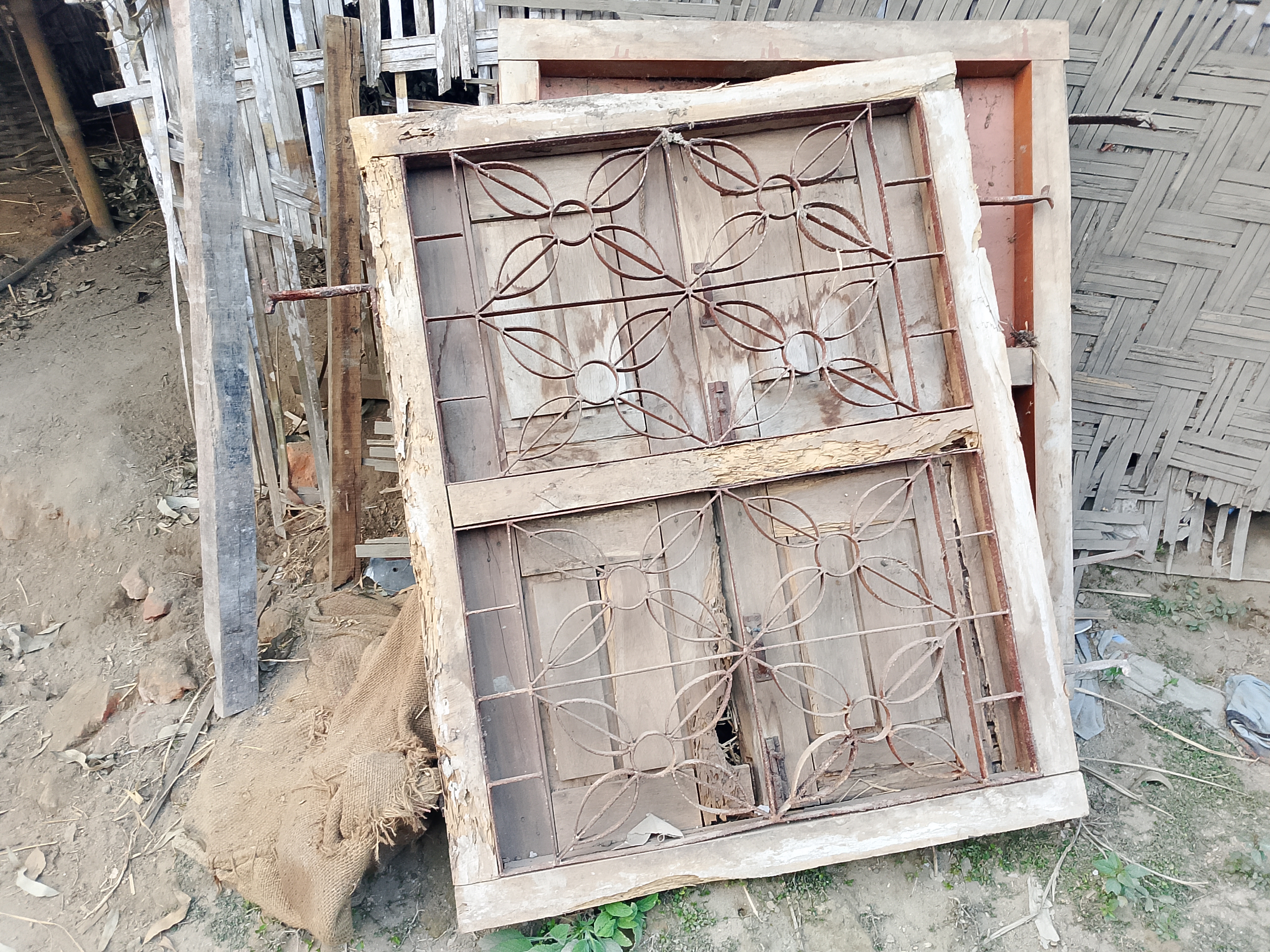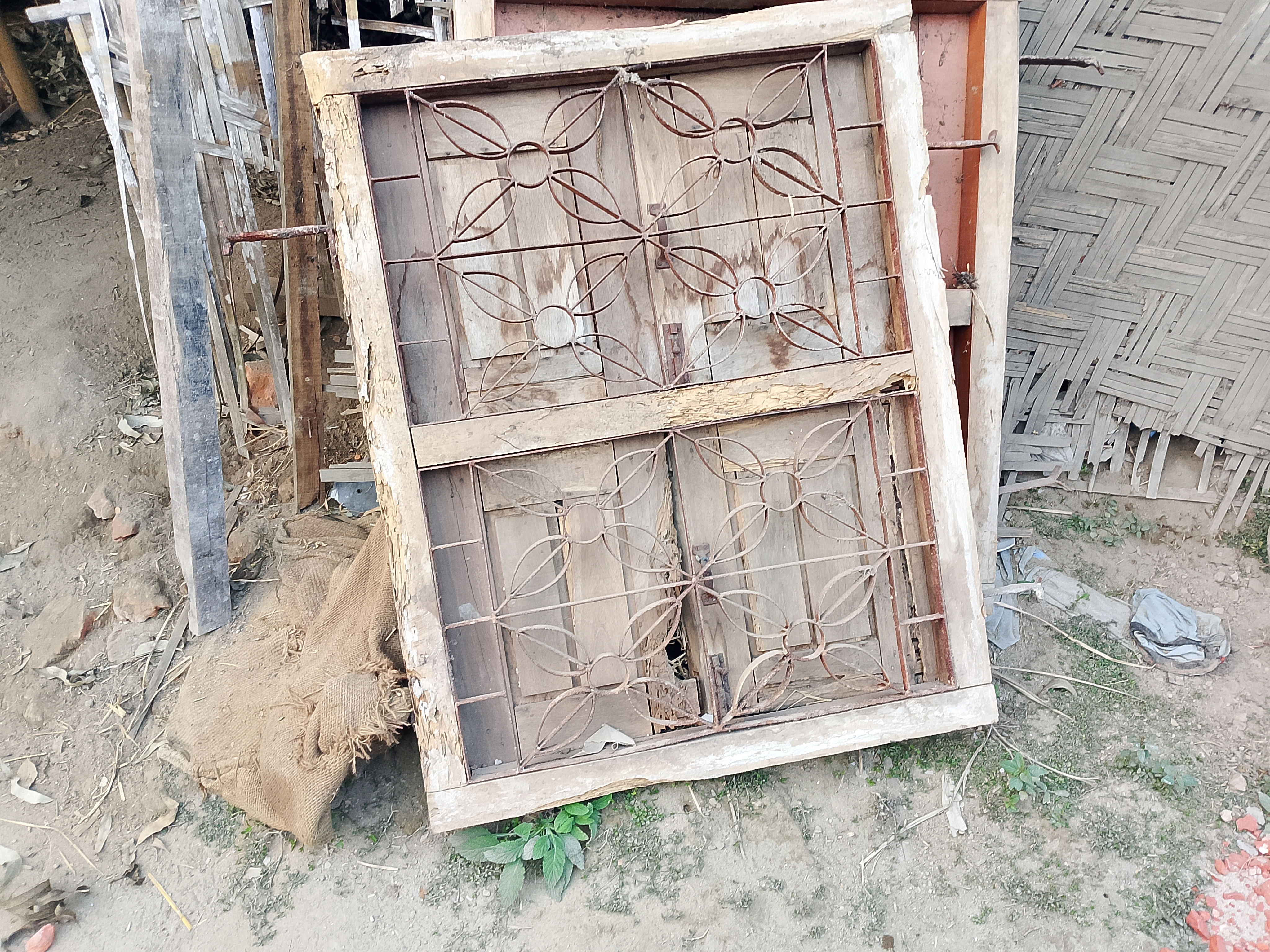 Two windows have been kept here. The windows kept here are quite old and have been used for many years. When work was done in our house, they were removed from there and kept here properly. Because they were kept here, these things remained. The iron parts here have rusted because they are very old.
