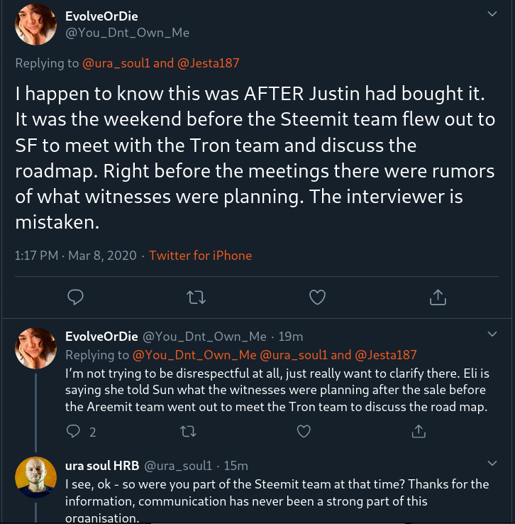 Here's an update that was just forwarded to me by someone on Twitter, following a thread by @jesta there. This was in response to my previous post that included audio from Eli the Steemit MD in which she said that she warned TRON in advance that the Steemit tokens might be frozen by the STEEM witnesses. The claim here is that this warning took place after TRON had bought the tokens, but before Justin had informed the exchanges that the tokens were frozen by 'hackers'.