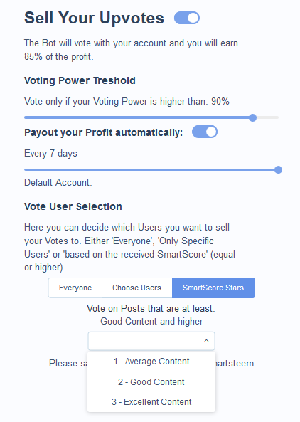 Lastly, probably the best option and the one that gives me hope that @smartsteem will be even better in the future is the Vote User Selection. Moderators give everyone whitelisted scores based on their content, so you can get one, two or three stars, meaning Good, Great or Excellent content, respectively. This is a great way to push quality content forward for everyone to see it. I personally like to sell my vote to Good content or higher because there are enough great creators on @smartsteem already and I get Steem Power from the curation rewards too.