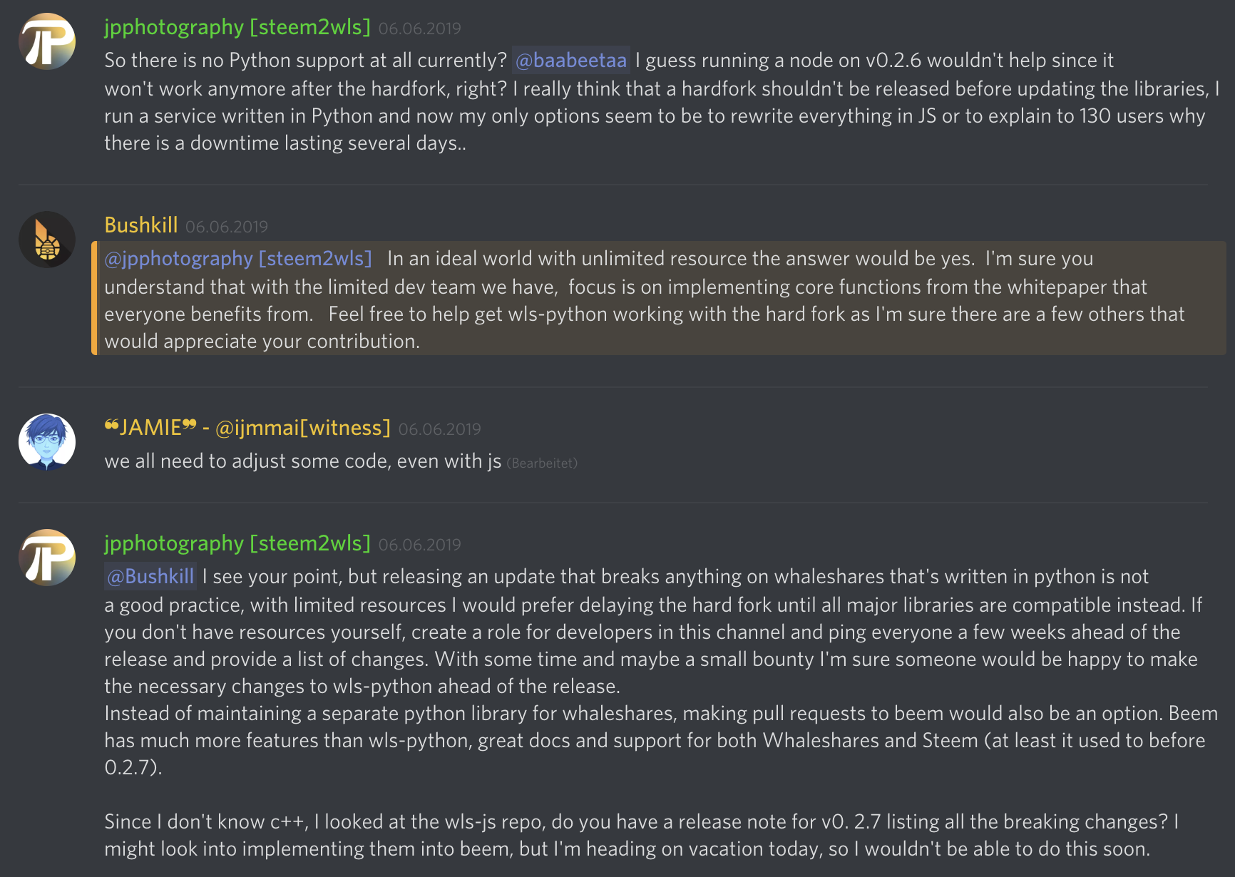 Without any announcement of the breaking changes, a new version for Whaleshares nodes was published by the Whaleshares dev team a little over a month ago and witnesses were asked to update in preparation for hardfork 2. The new node version completely changes the way the API works, but the Whaleshares team has not published an updated version of their Python library wls-python yet, nor published the source code of the new node version nor a list of changes, which would make it much easier for the community to update wls-python or beem. As a result, all apps and services written in Python cannot send transactions to the Whaleshares chain anymore.