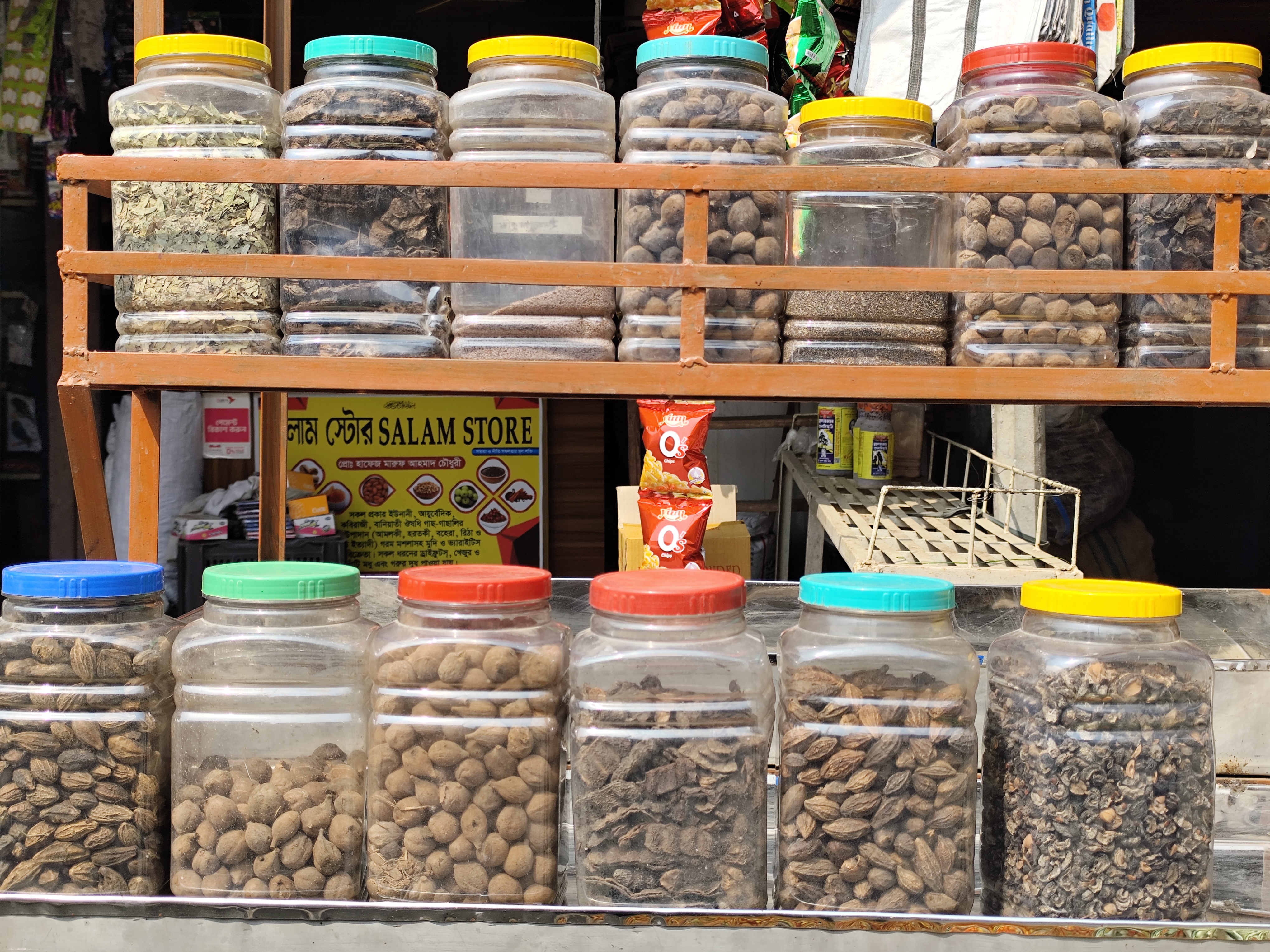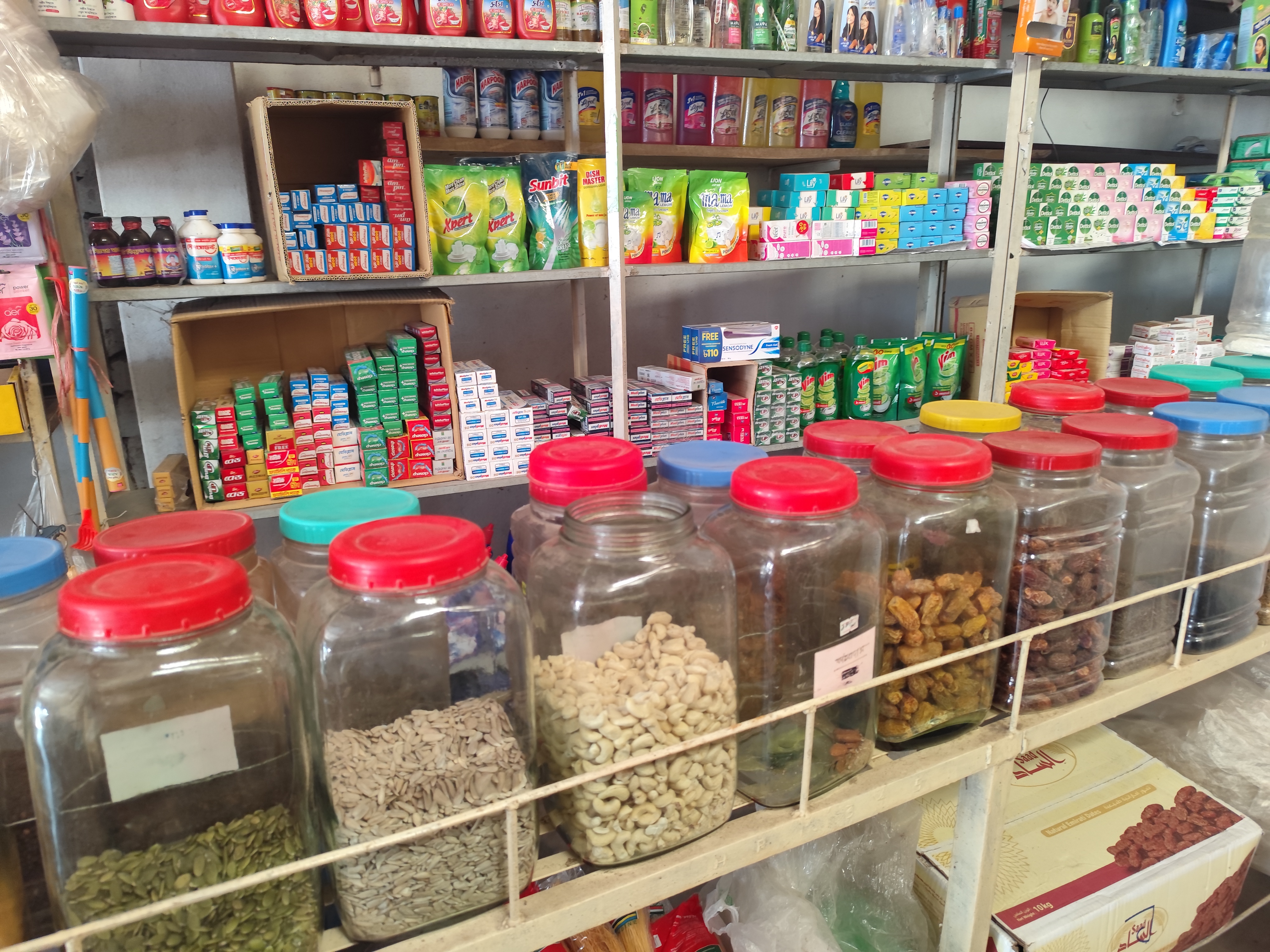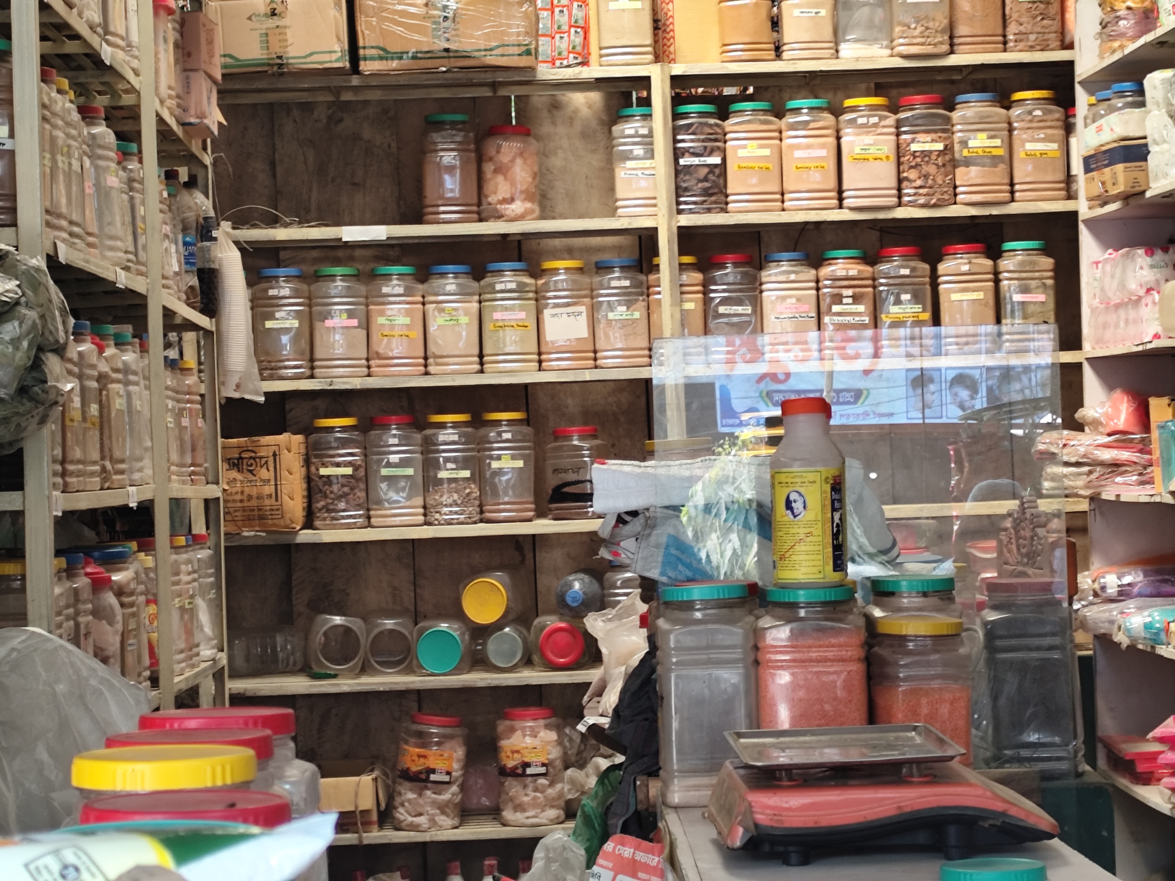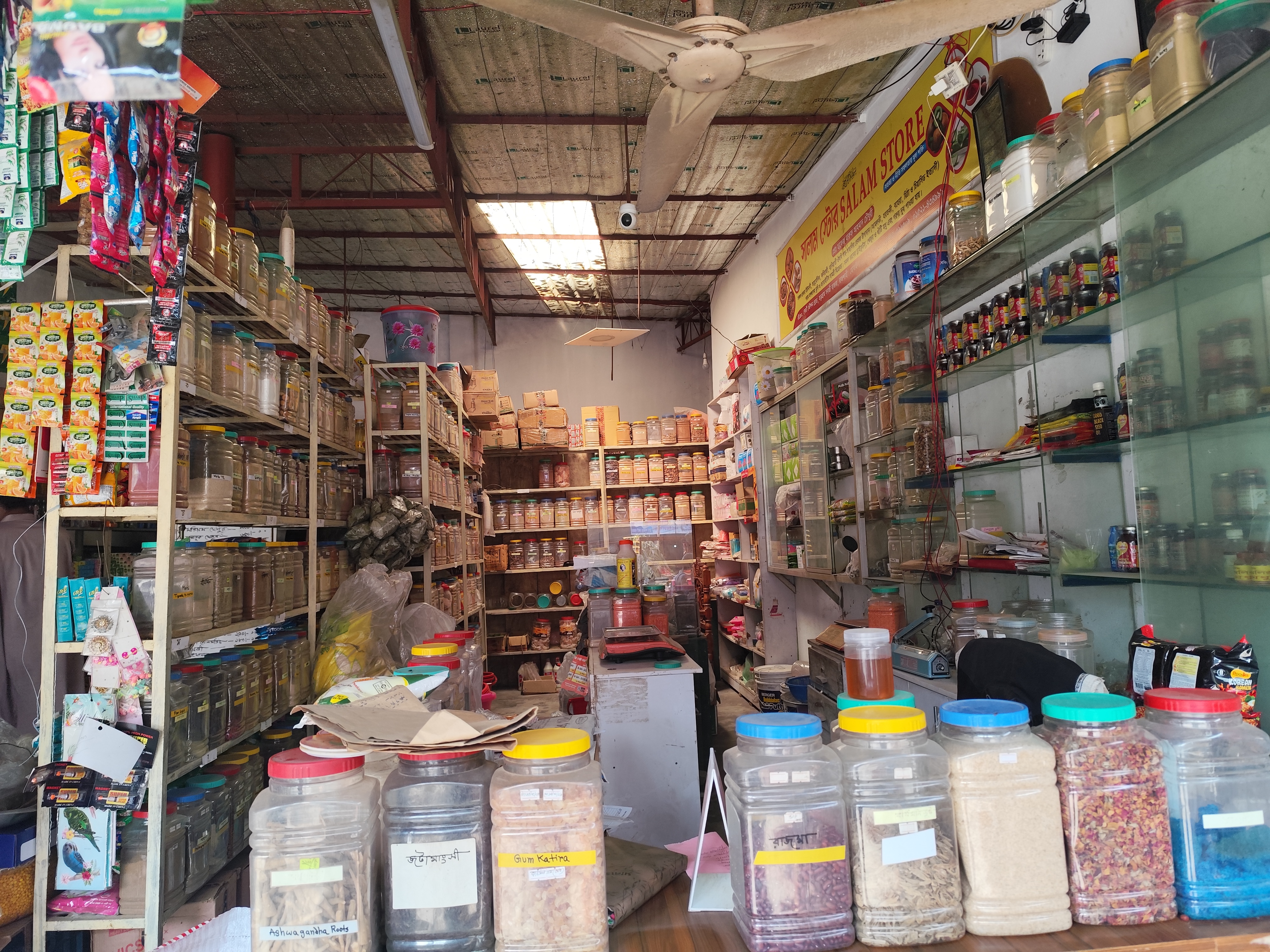 The shop is adjacent to the main road, after entering the shop, you will see a large tinned shop with a partition along the middle. On one side there are shelves decorated with jars of various types of herbal medicines, on the other side there is a collection of other daily necessities including rice, pulses, dry fruits and numerous products.