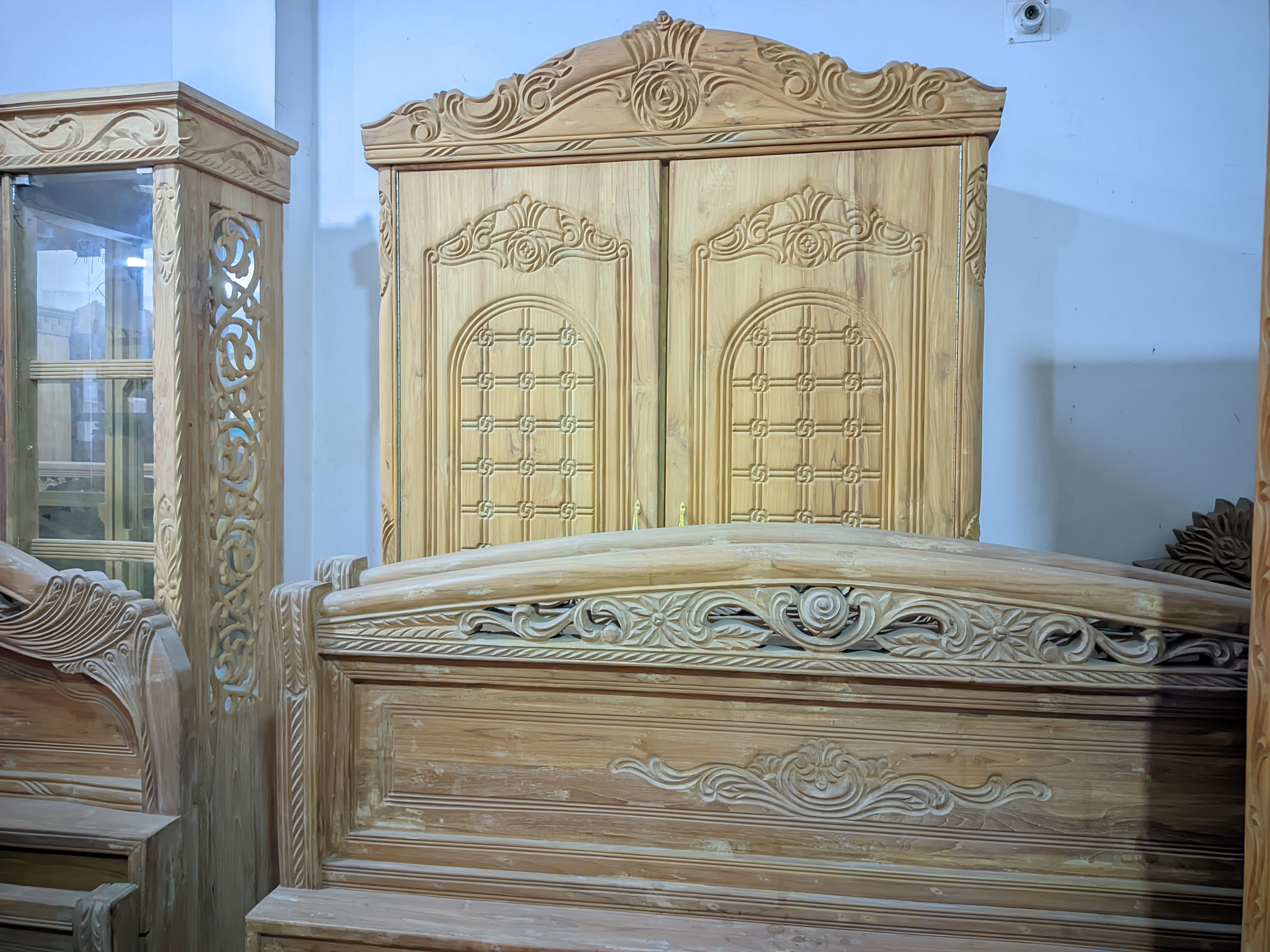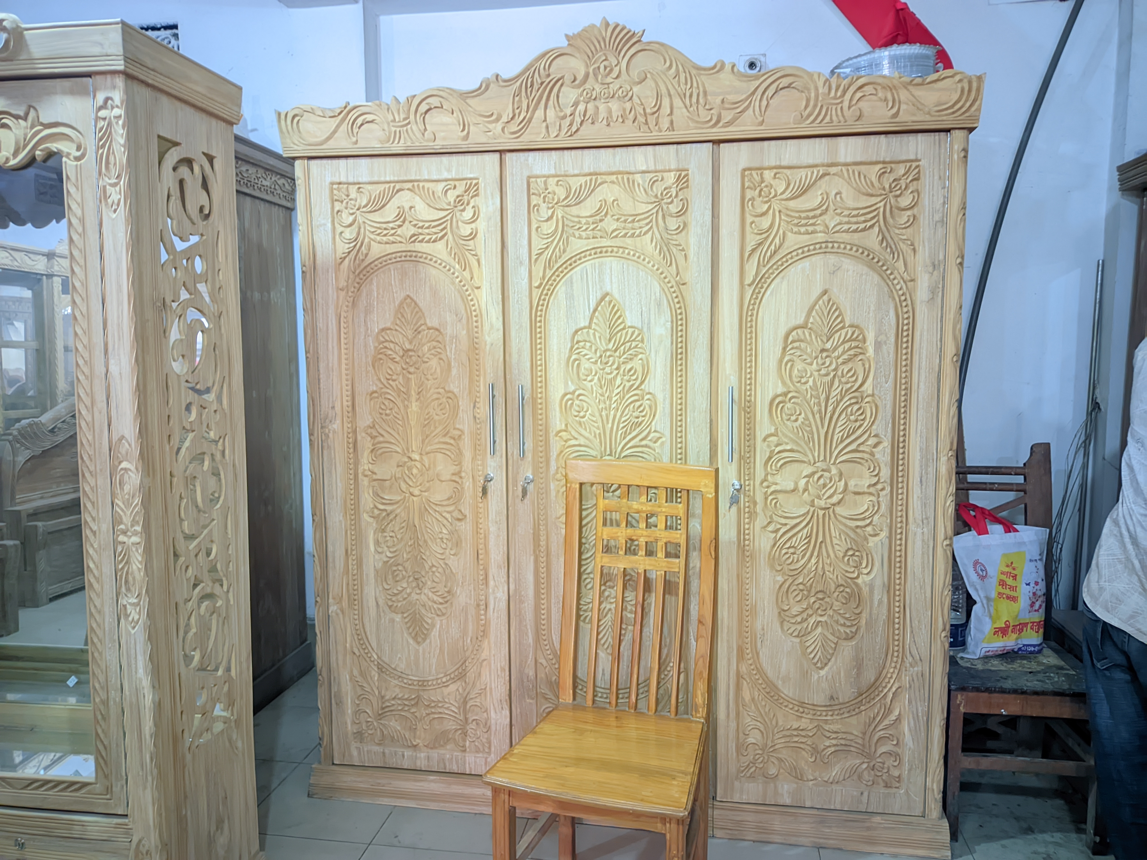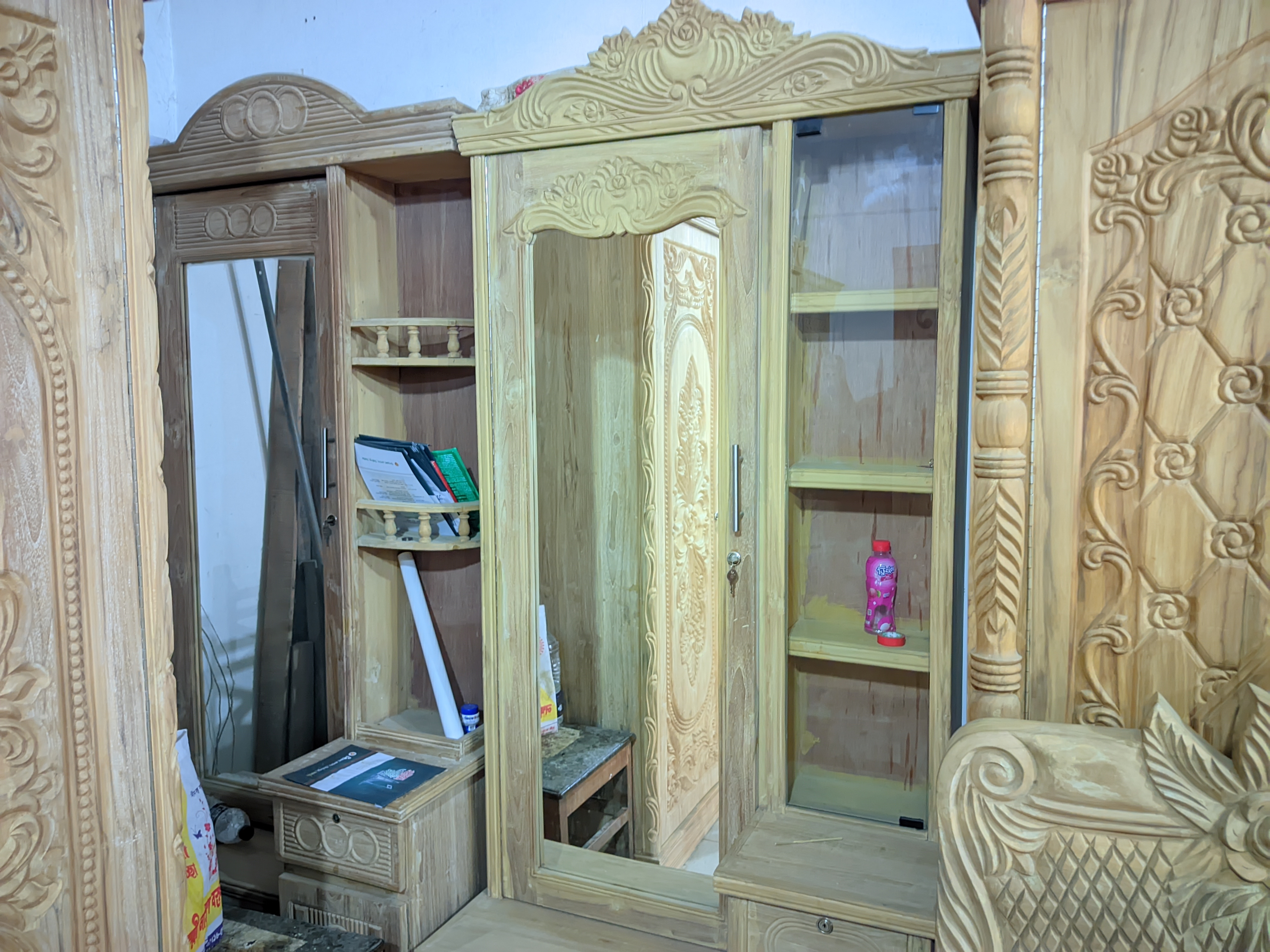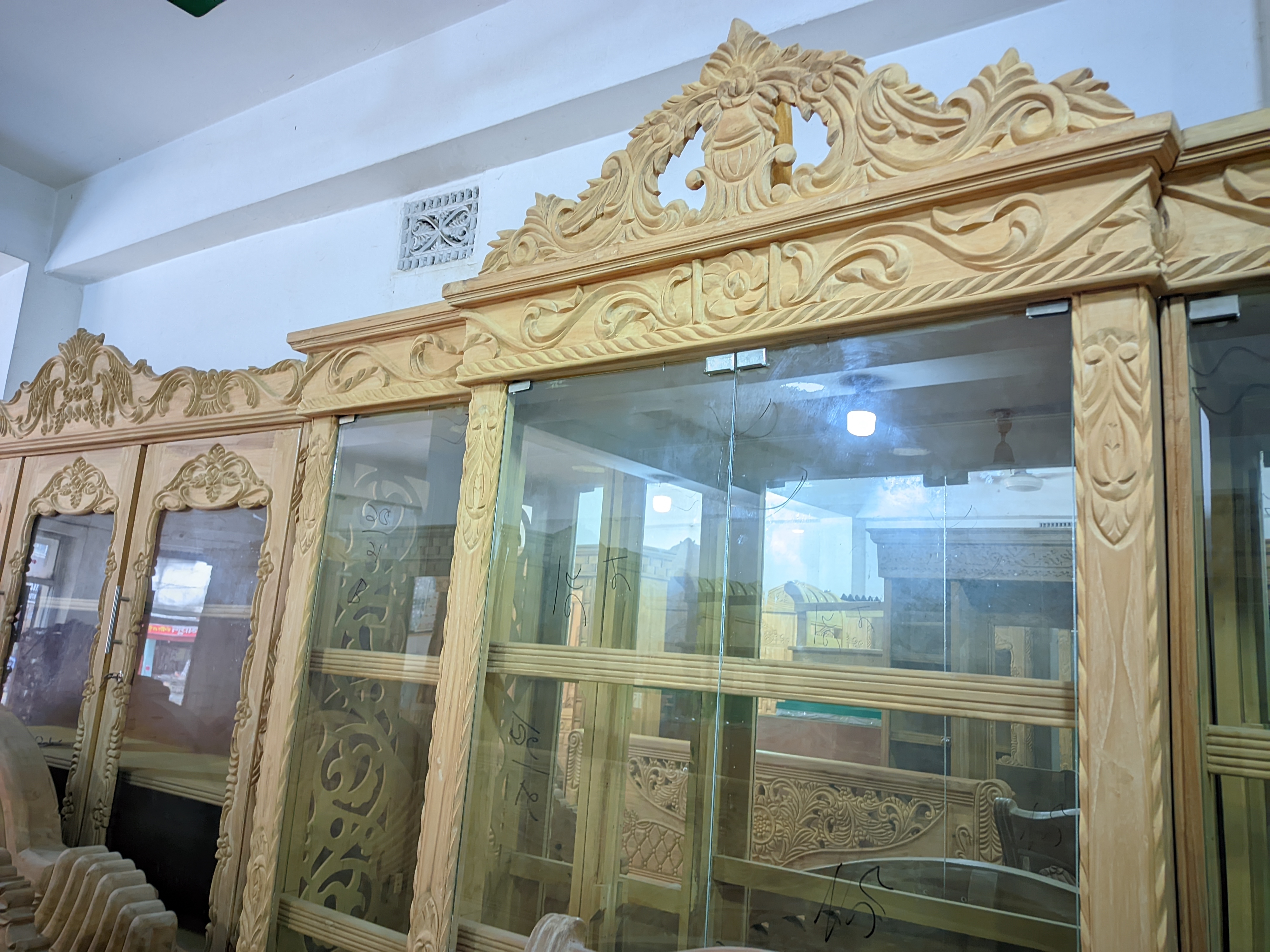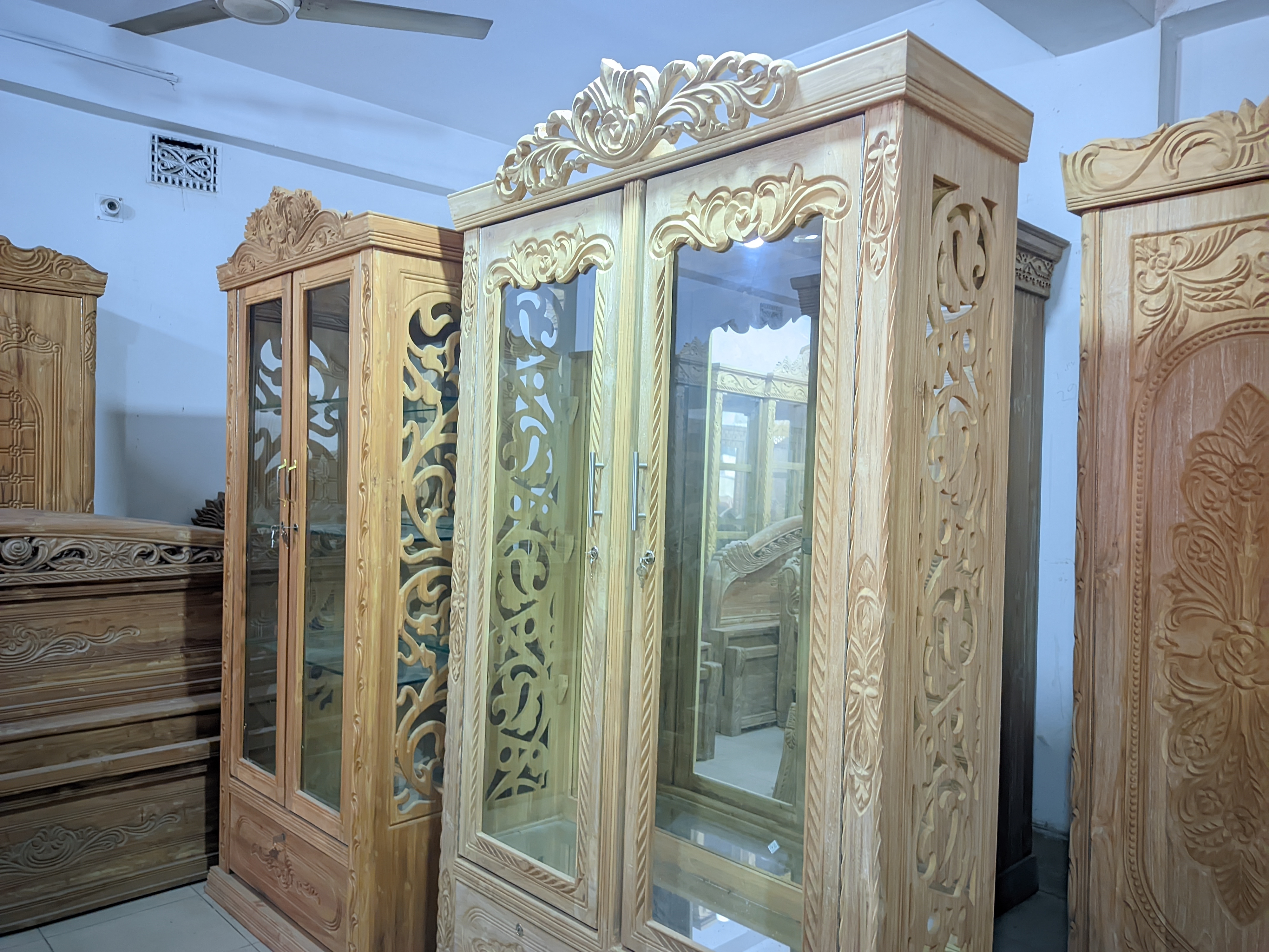 The furniture is made entirely of wood, but sometimes glass is given as per the demand of the customers. Here, beautiful glass is given and it is strong. There are dressing tables and showcases of different sizes.