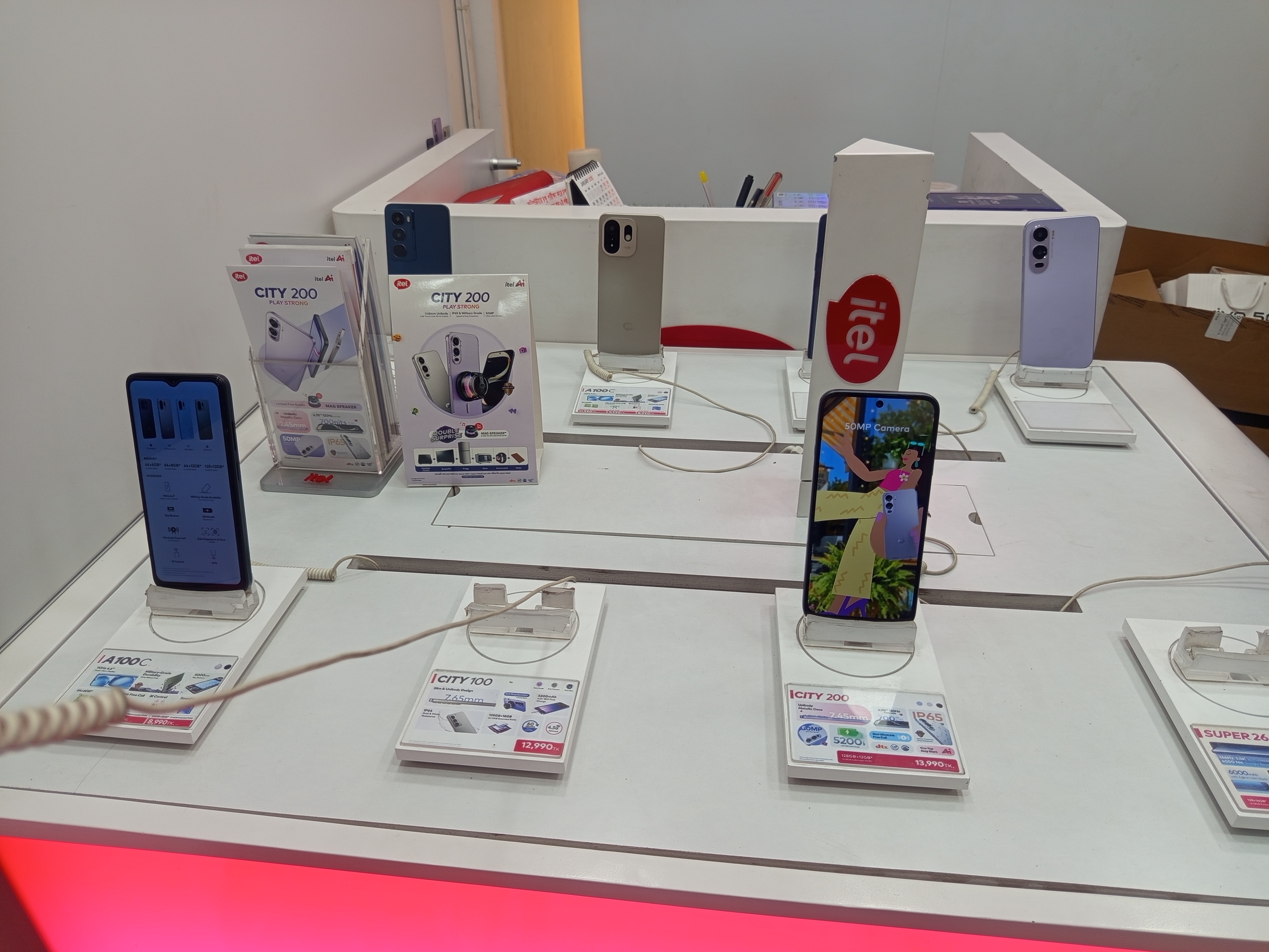 After entering the showroom, you will notice the lighting decoration on the ceiling. I really like the lighting decoration. A wall with the Itel logo has been built. It is decorated with white lighting. The atmosphere inside the mobile showroom is completely temperate. There is an AC system here to maintain a temperate environment. At the same time, sufficient mobile collections are presented here.