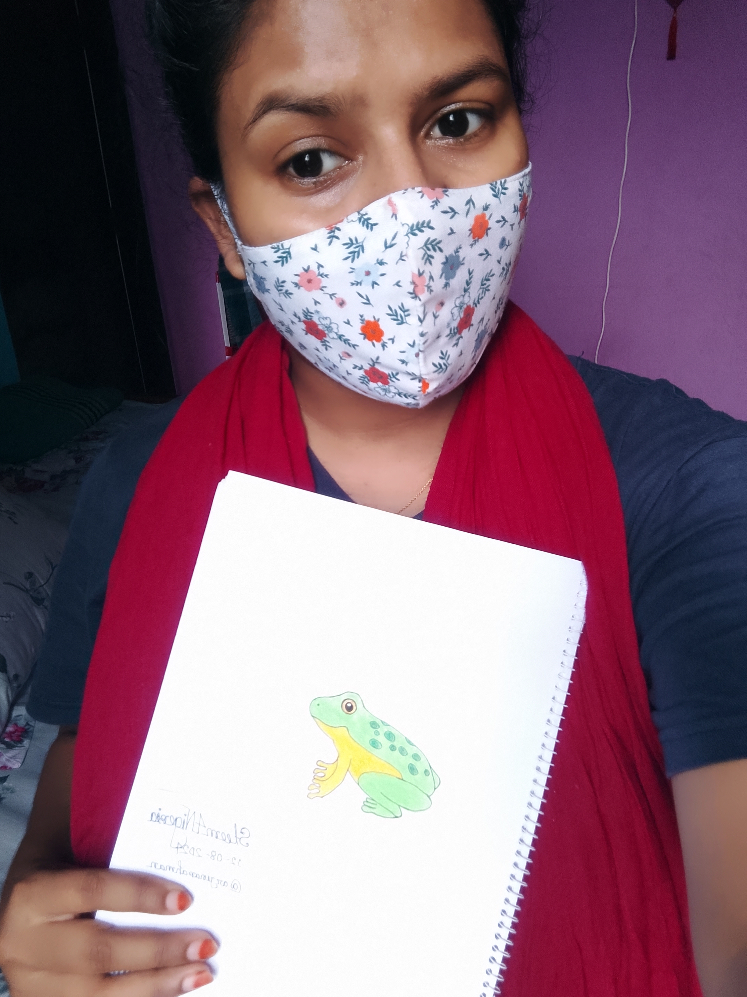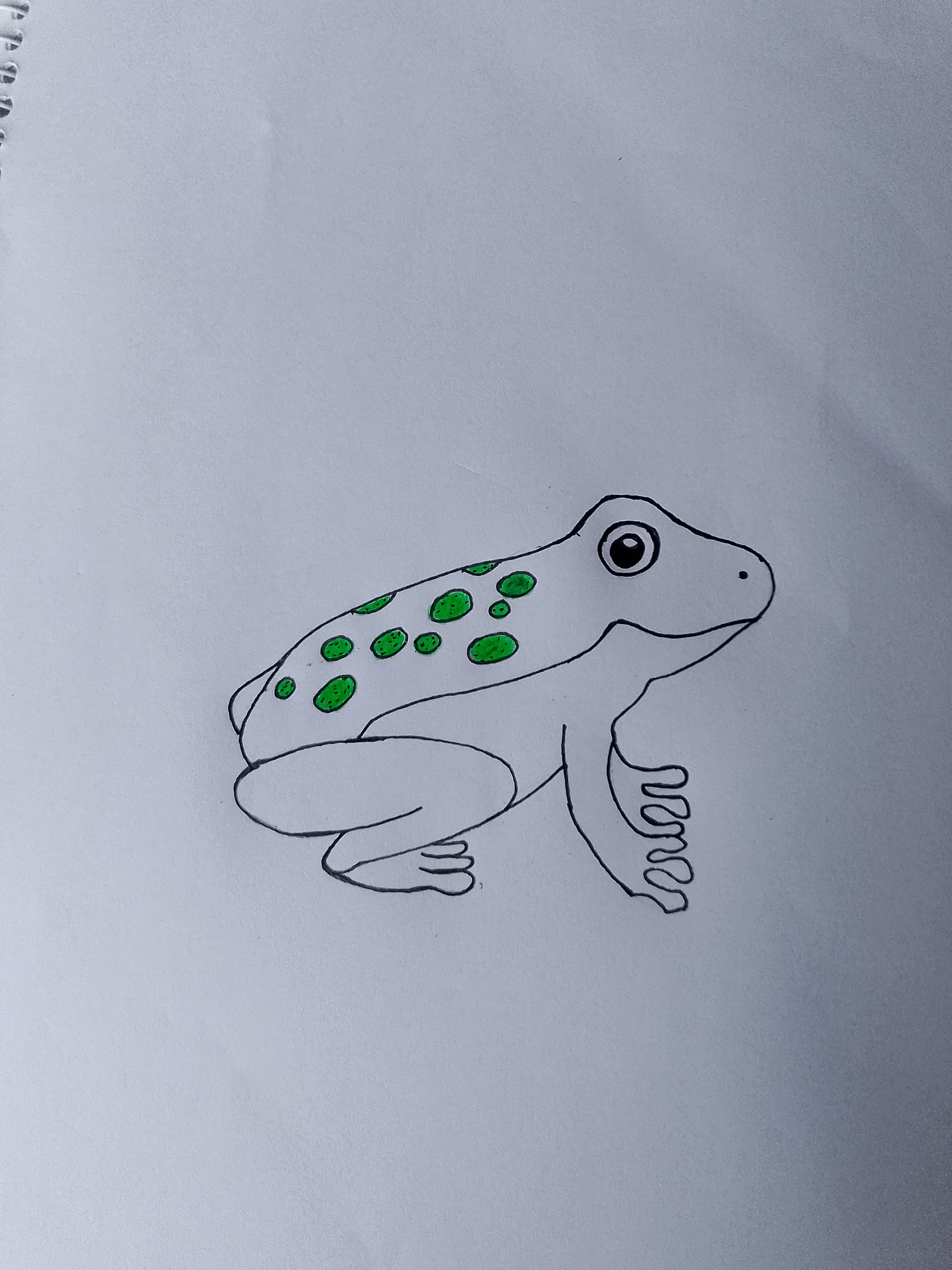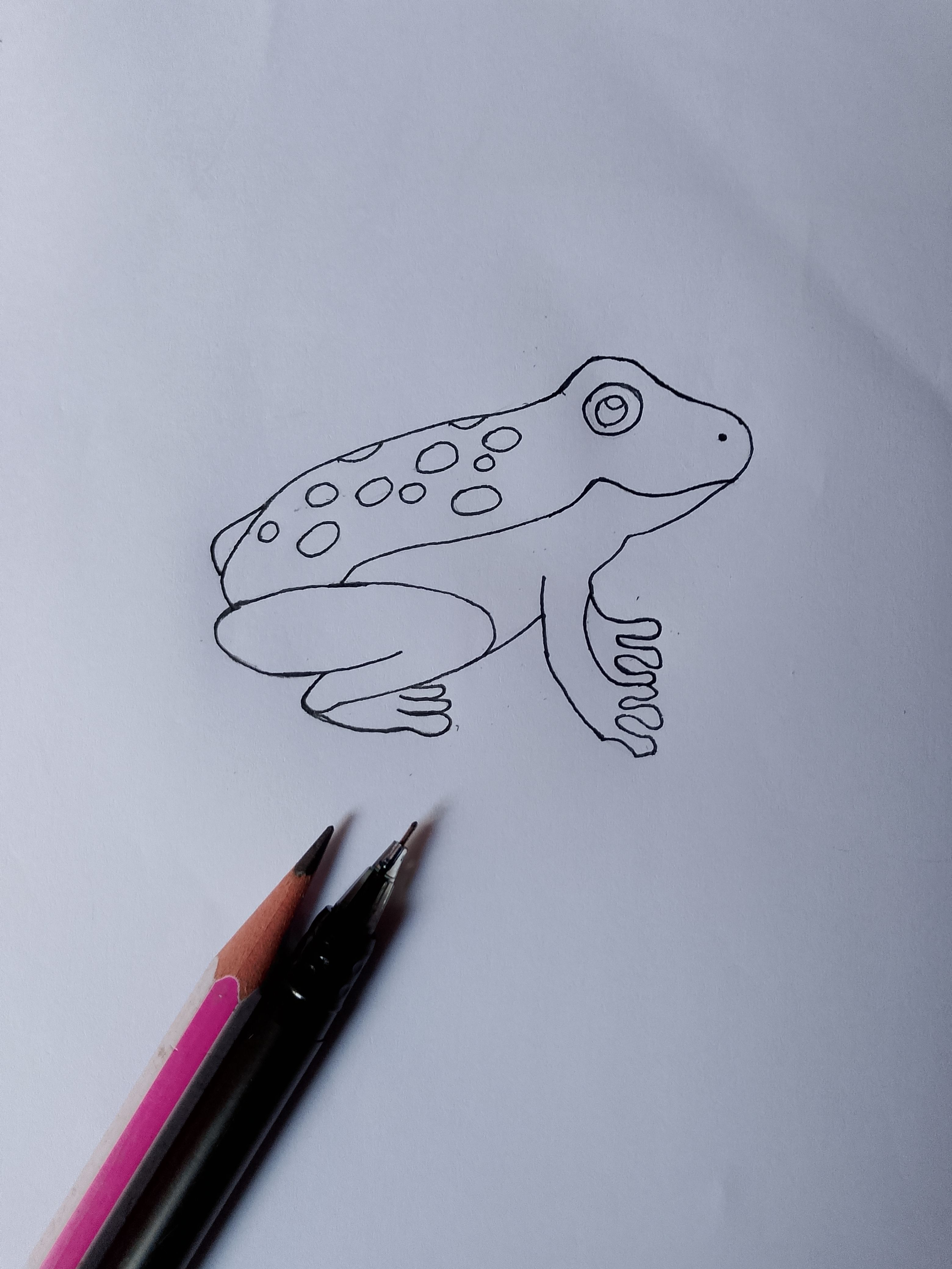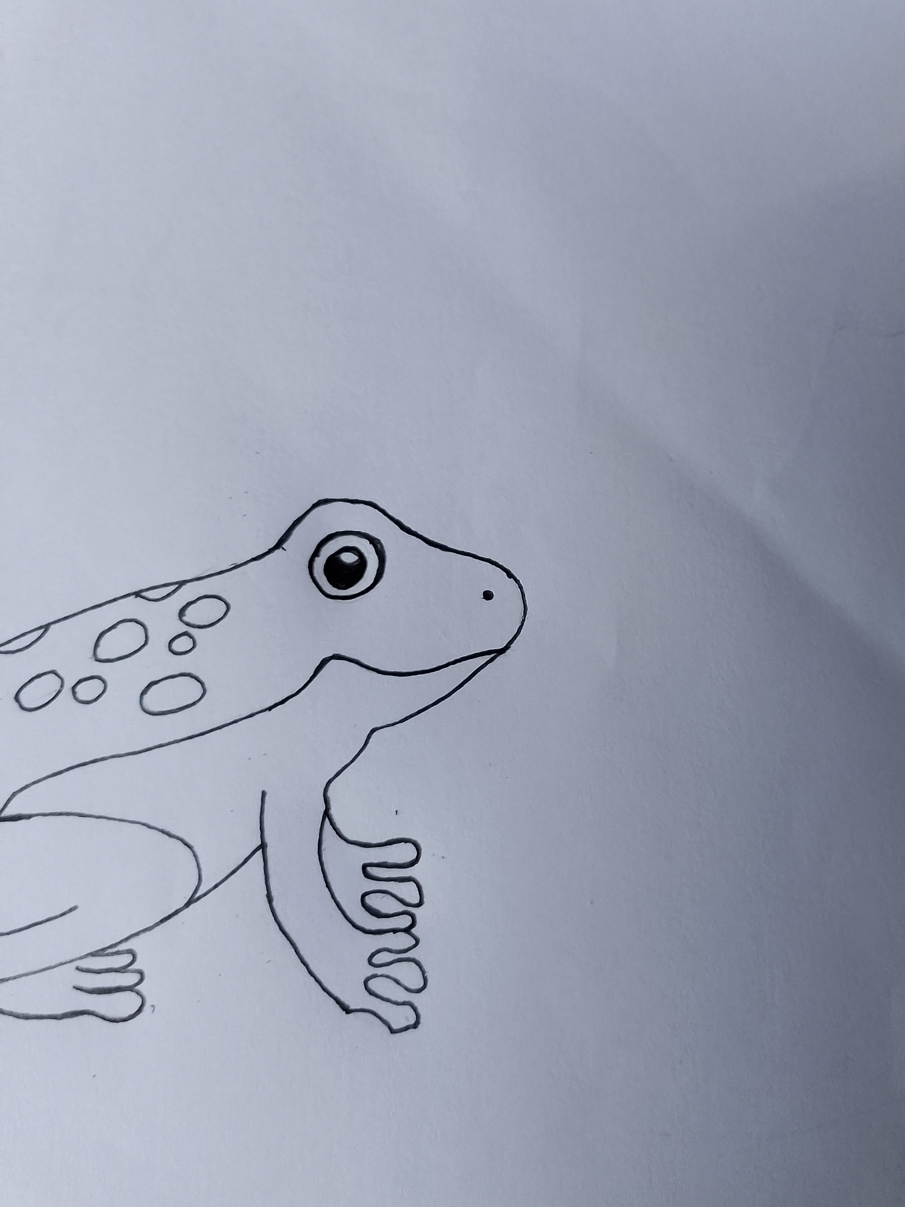 🔹Once the entire sketch of the frog was done, I used a gel pen to clearly outline the sketch.I tried my best to capture the body, eyes, and legs of the frog. As you can see, my drawing is almost complete.