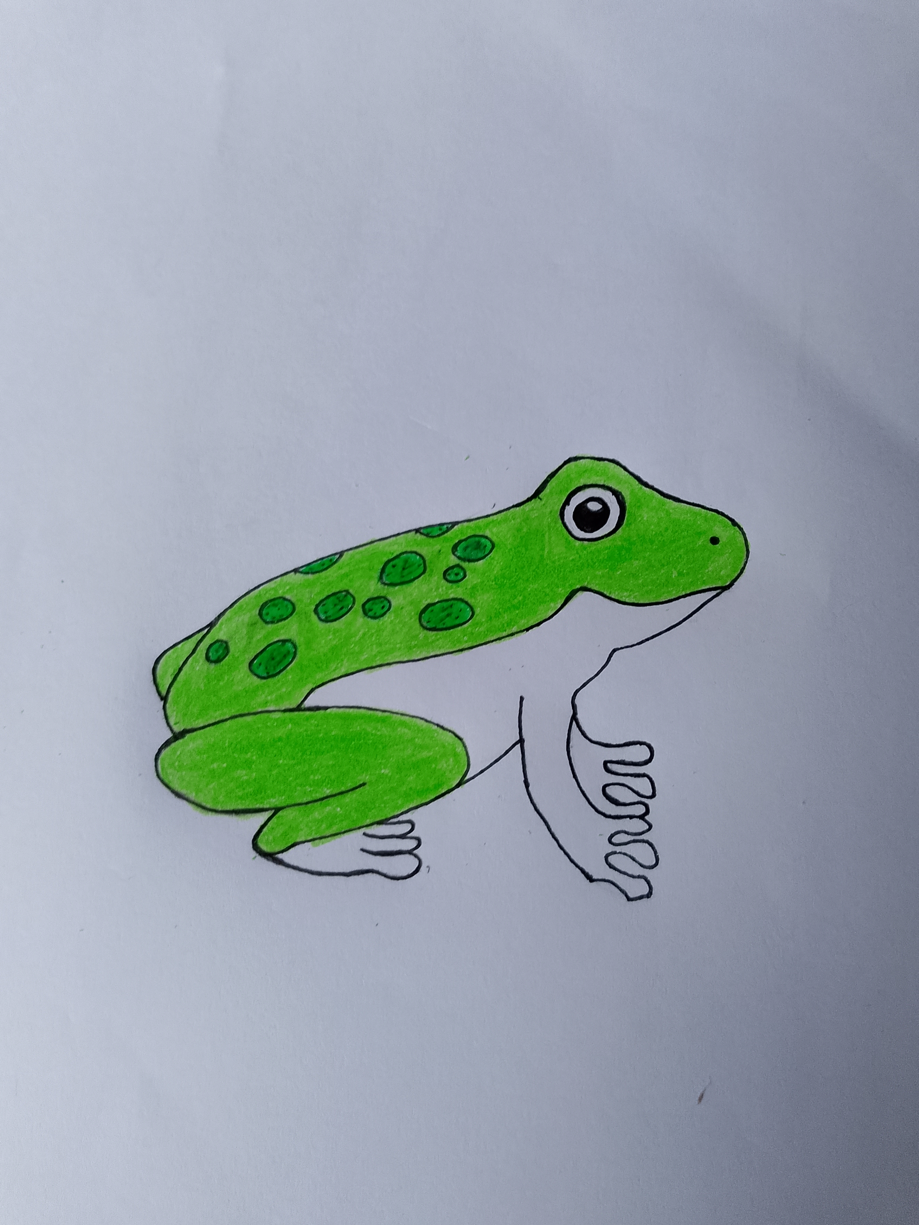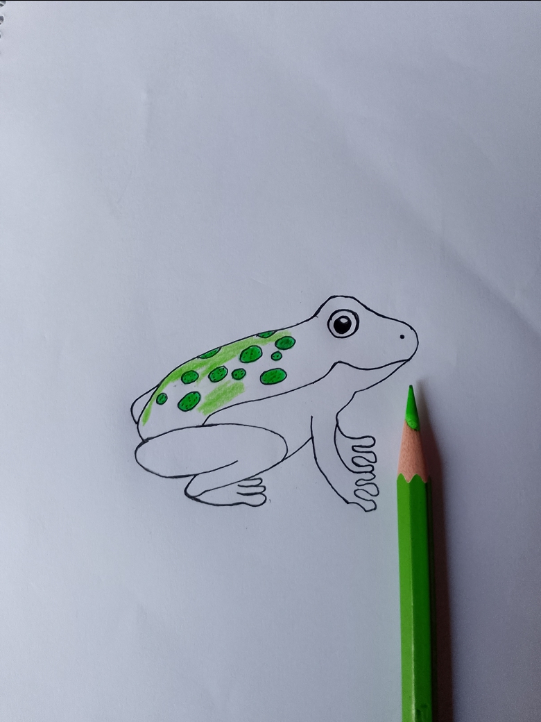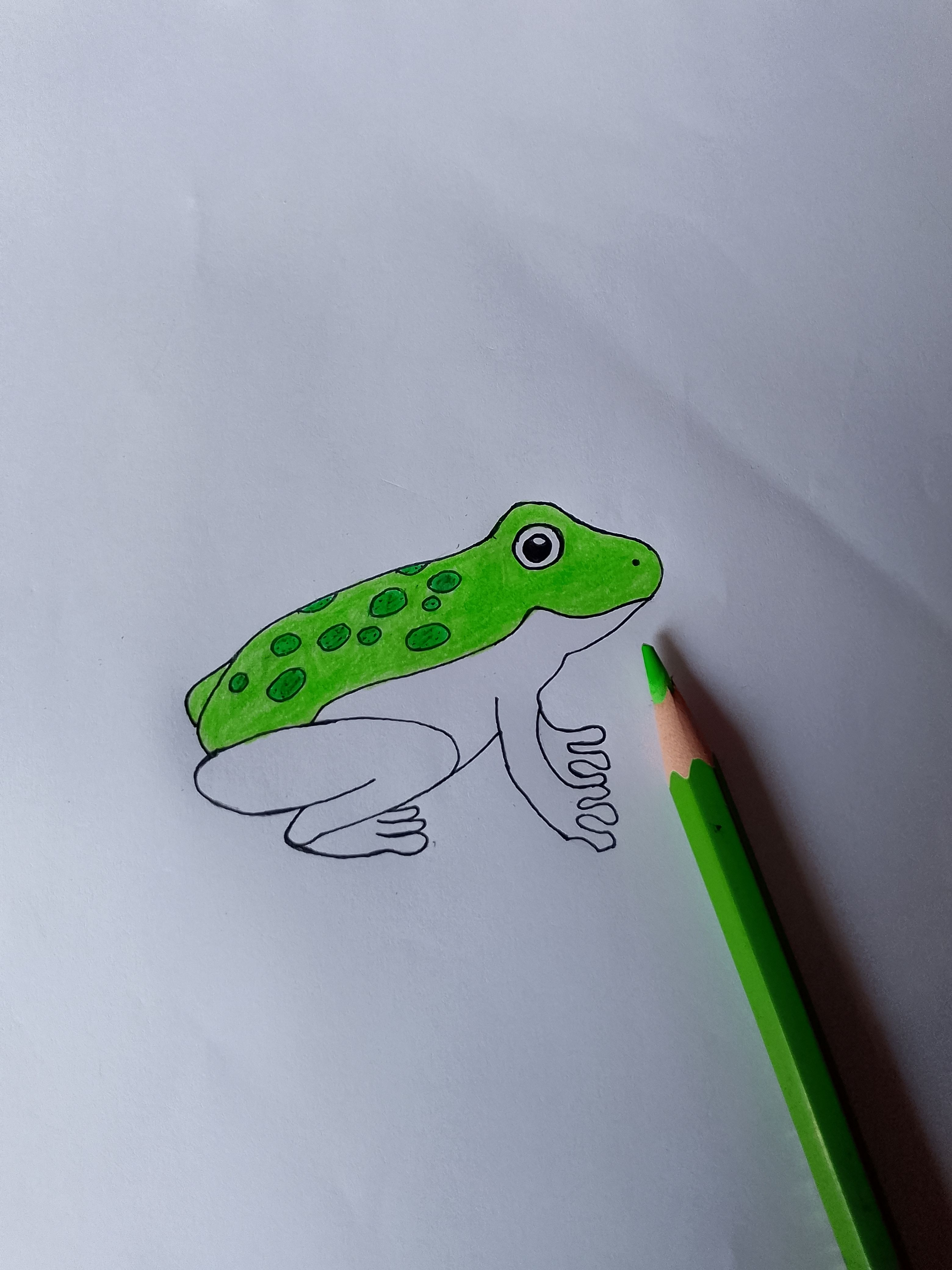 🔹In this step, I will color the oval shapes on the upper body of the frog in dark green. Once the green coloring is done, I used a gel pen to make small dots on its body. As you can see, the coloring of the oval shapes on its body is complete.