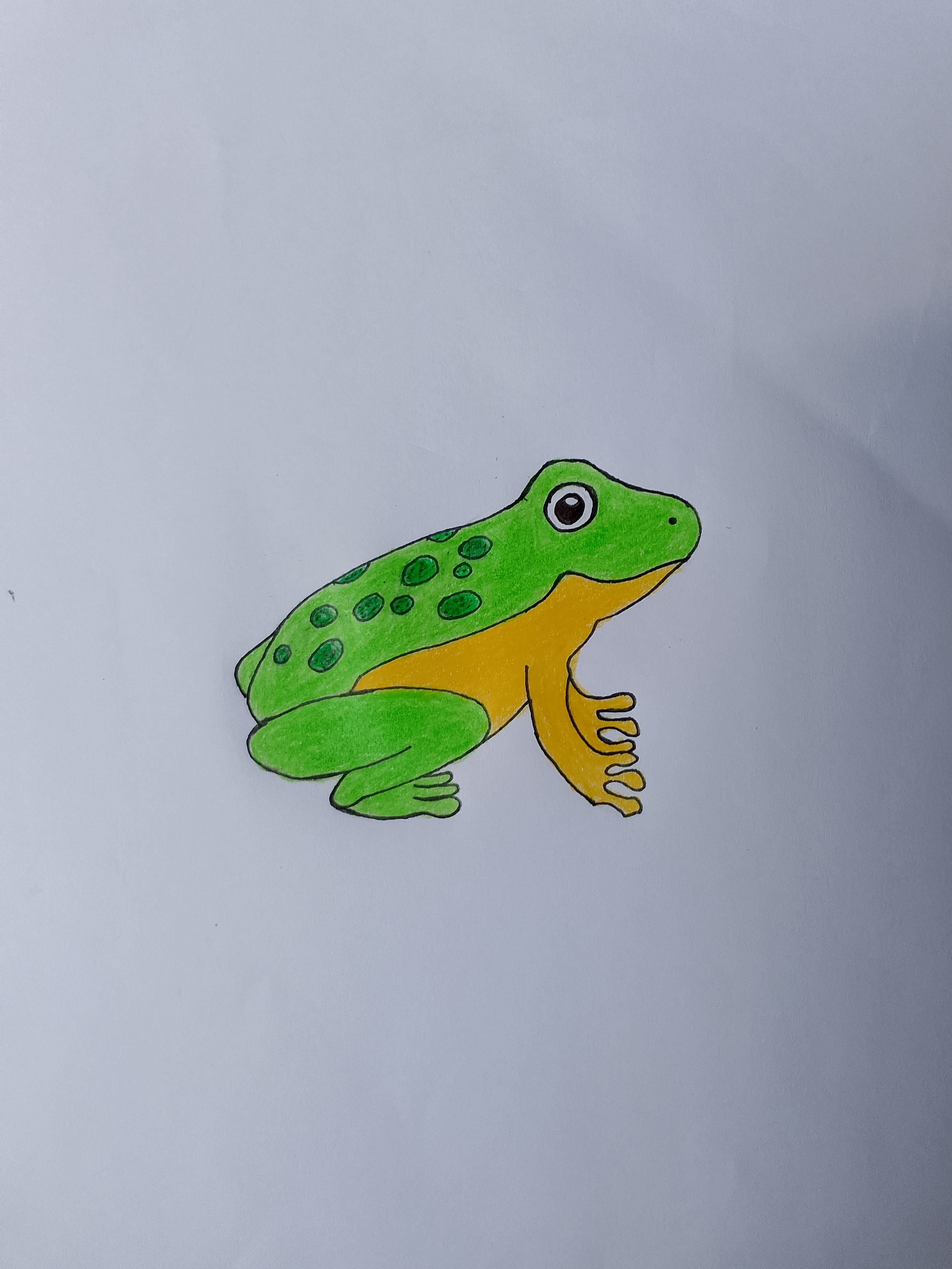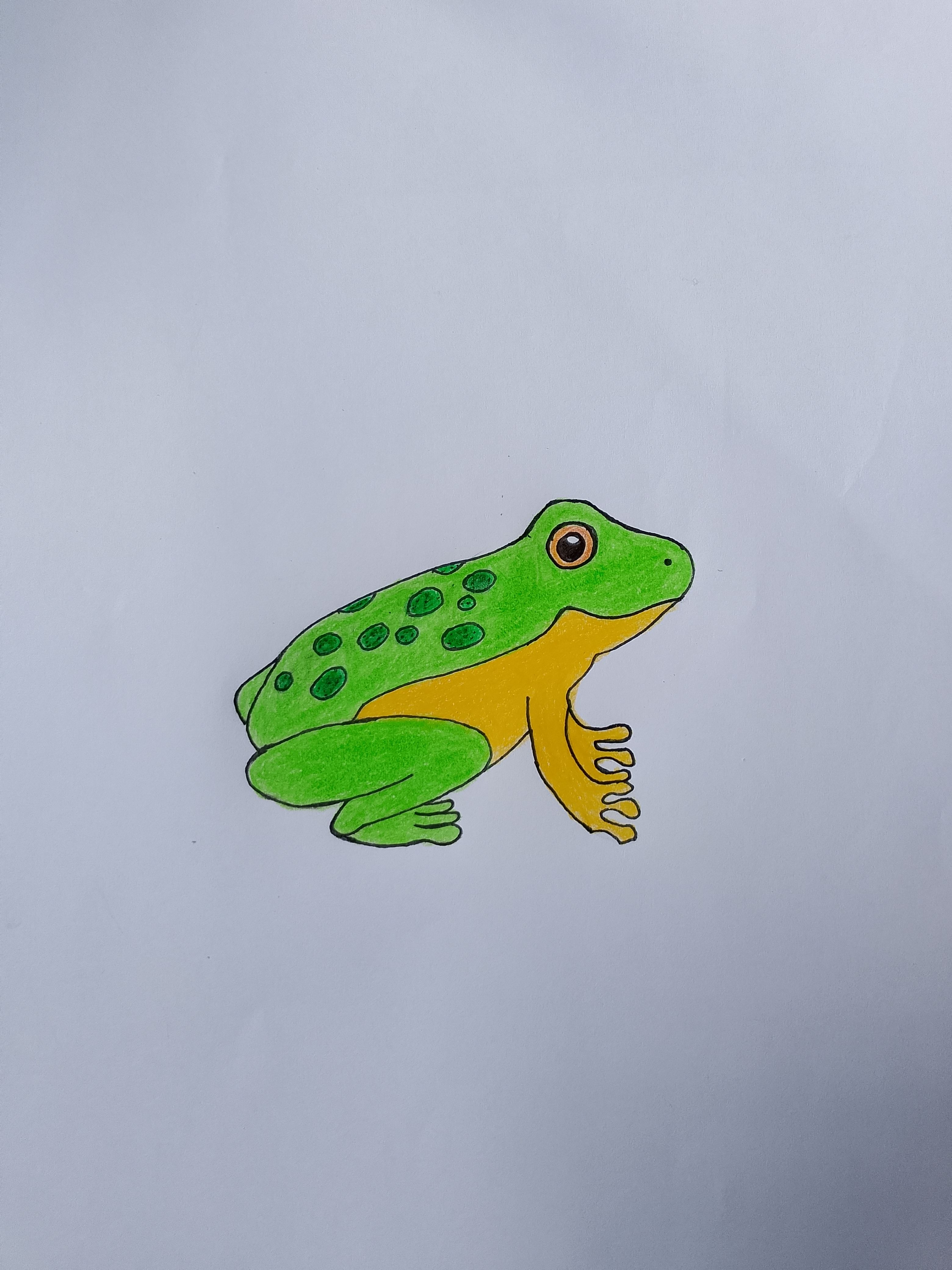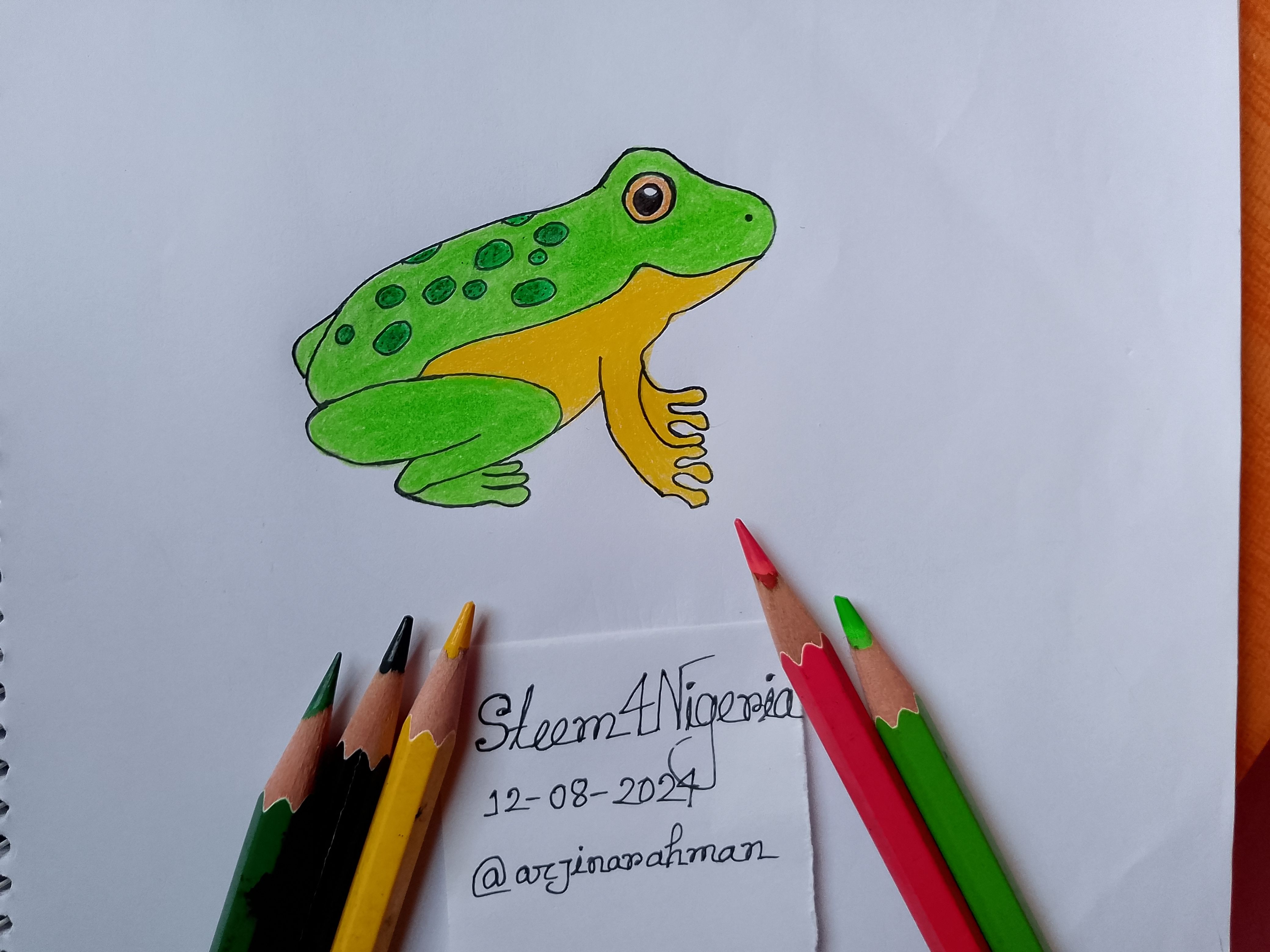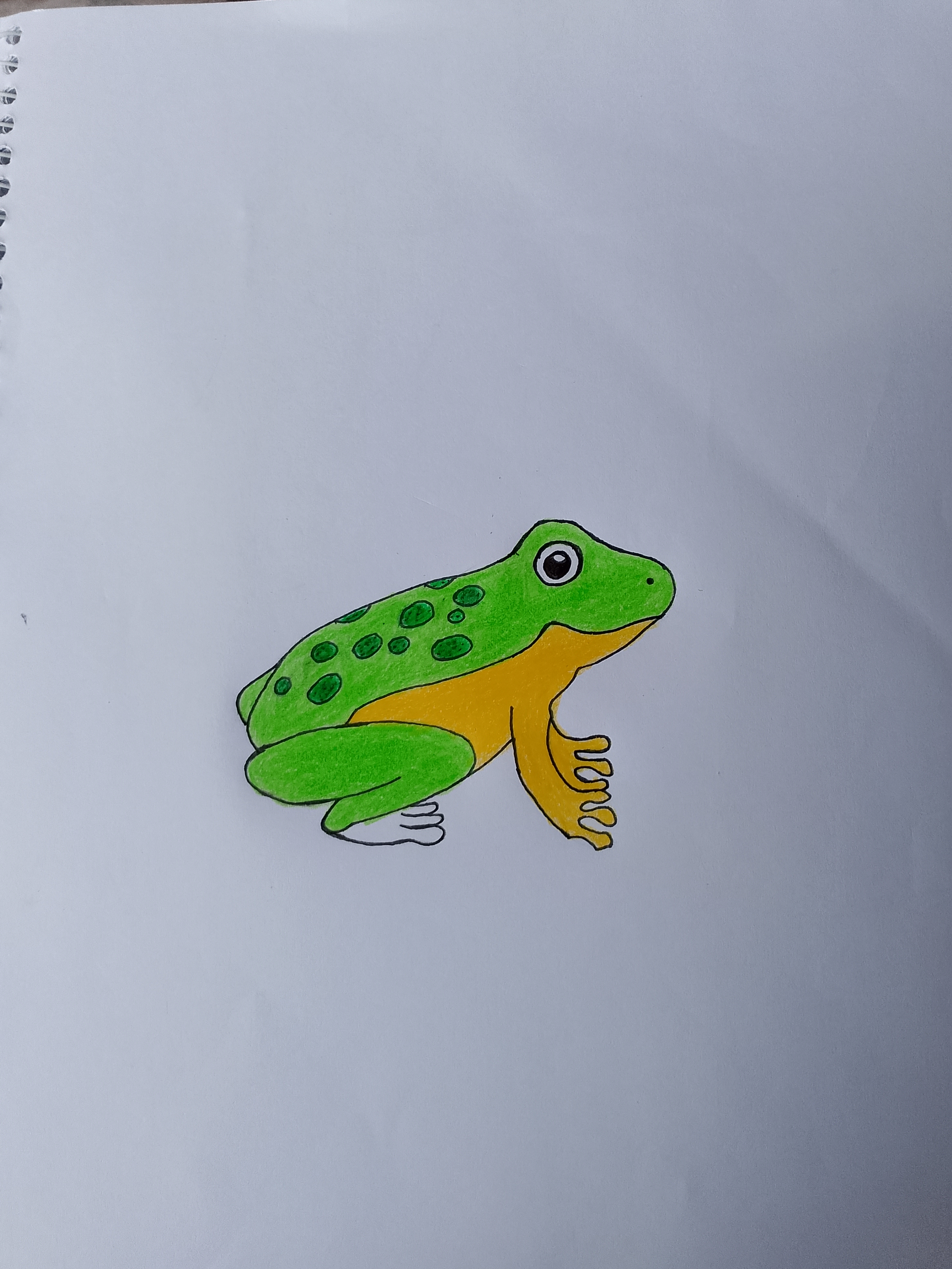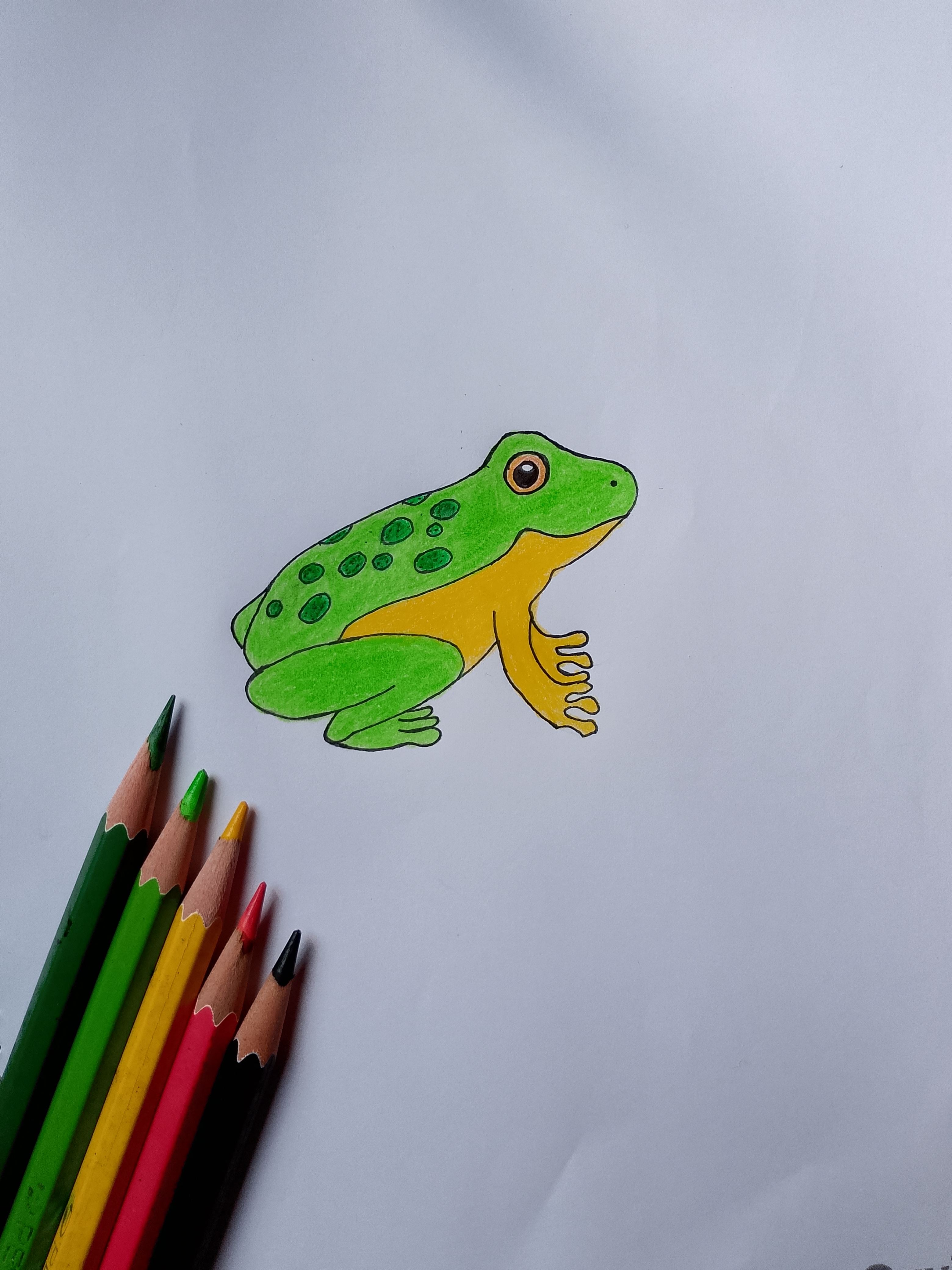 🔹Finally, for the middle black part of the eyes, I used a combination of yellow and red colors. At this stage, my coloring of the frog is almost complete, as you can see from the picture.