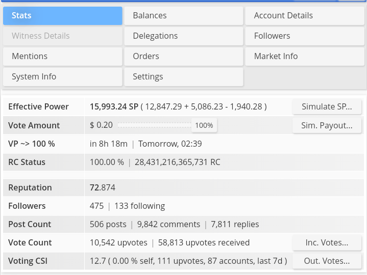 My Own SP is 12,847 My Voting CSI 12.7 ( 0.00 % self, 111 upvotes, 87 accounts, last 7d )and I have a Reputation score of 72.874, as of the time I write this application.