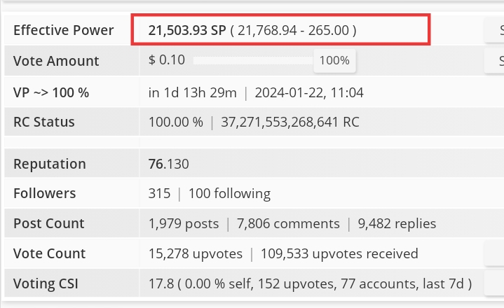 As of the time of writing this application, my own SP is 21,768.93. My voting CSI is 17.8, and I have already distributed 152 upvotes to 77 accounts in the last 7 days. I have a reputation of 76.130, and I have delegated 265.00 SP to 1 community. The screenshot below shows the information that is discussed.