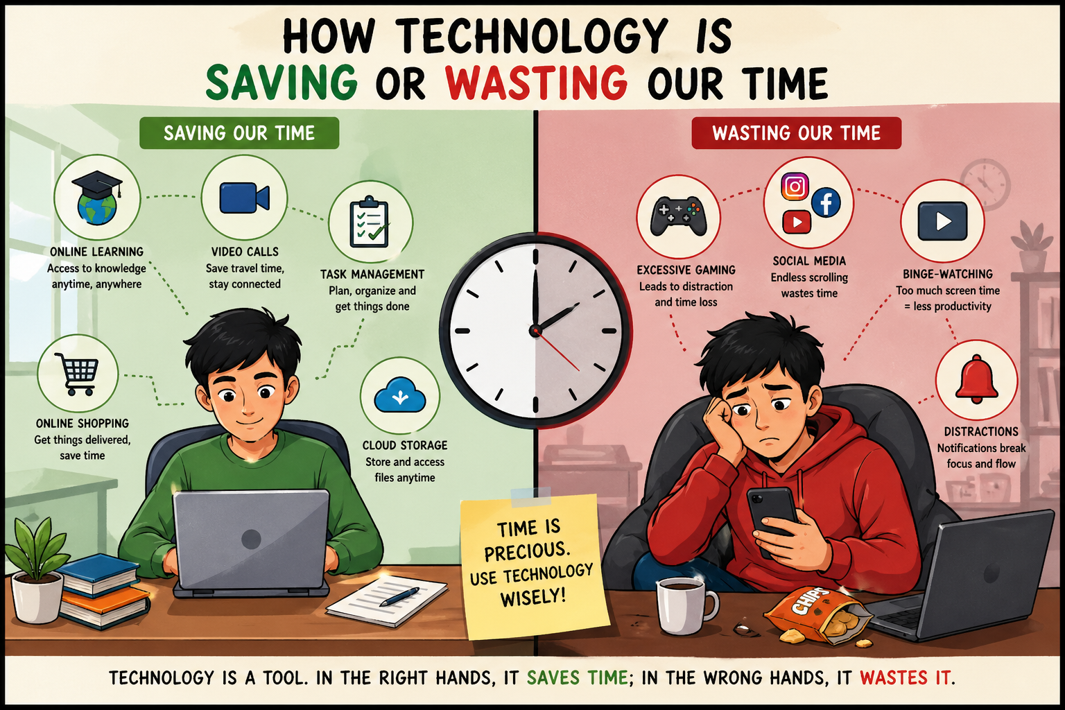 On the other hand technology can also waste our times if we do not use it wisely.Social media is one of the biggest reasons for time wastage.Many peoples spend hours scrolling through videos watching reels or checking updates again and again without any real benefits. Online games and binge-watching movies or dramas can also takes up a lot of times especialy when people lose control and forgets their responsiblities.Notfications from apps also distractd us again and again making it difficults to focus on important worked or studies.