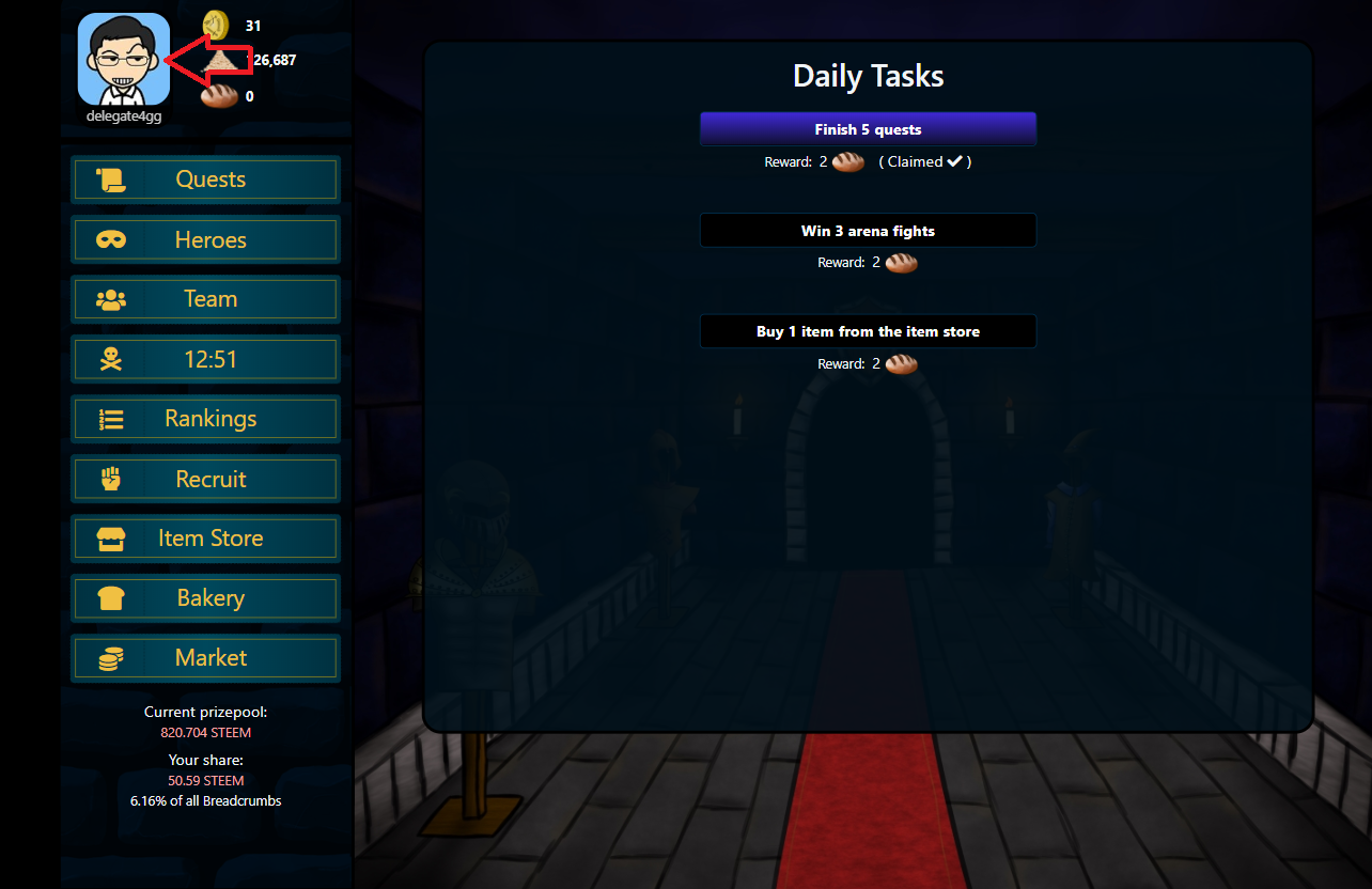 We can find our daily tasks to earn bread by clicking our avatar.