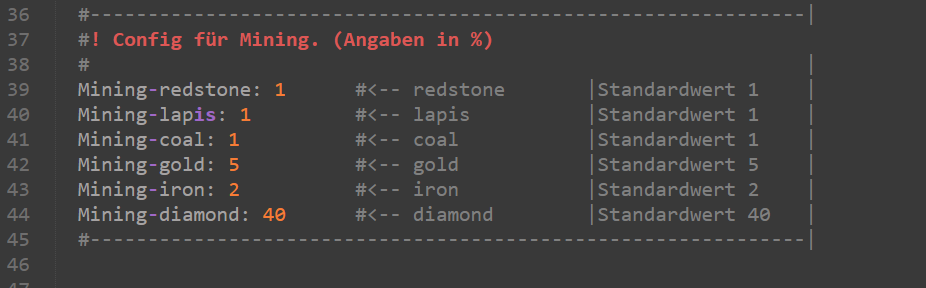 Wie bereits erwähnt lässt sich die Wahrscheinlichkeit zusätzlichen Mining-Speed zu erhalten vom Serveradmin verändern. Ebenfalls lässt sich einstellen, welcher Block wie viel Speed hinzufügen soll. In der Standardkonfiguration haben wir es bei allen Erzarten bei + 1 Speed gelassen.