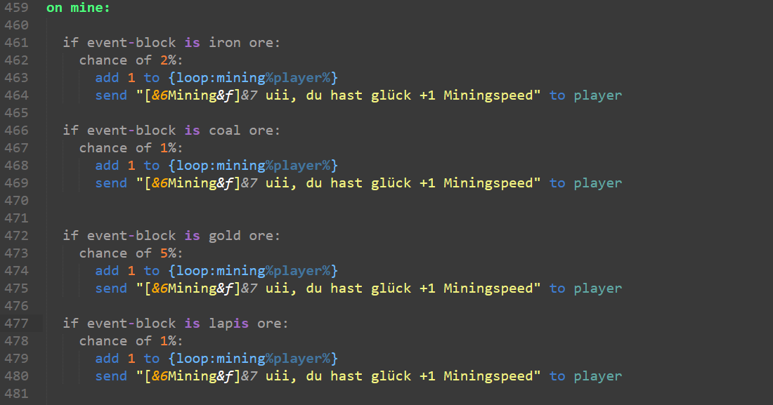 As already mentioned, the probability of receiving additional mining speed can be changed by the server admin. You can also set which block should add how much speed. In the standard configuration, we left it at +1 speed for all types of ore.