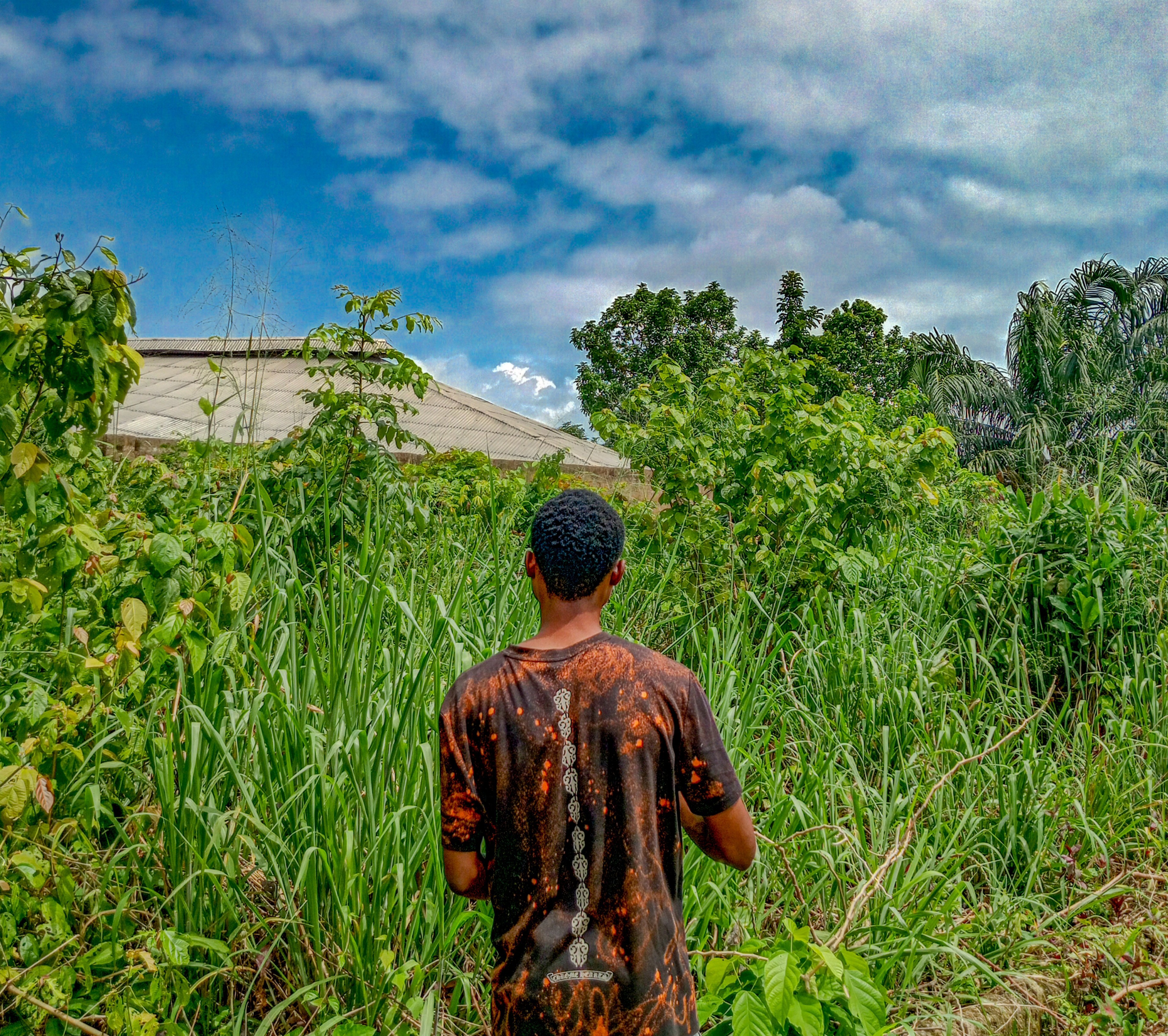 In this picture(photography), I am standing inside my farmland full of grass to be cleared. The grass shows that there's a lot of work still waiting for me in this farm because maize planting season is ending soon. And I haven't started planting yet. Standing in the farm my eyes look up to the sky. I don't speak, but the silence here shout more than any word.