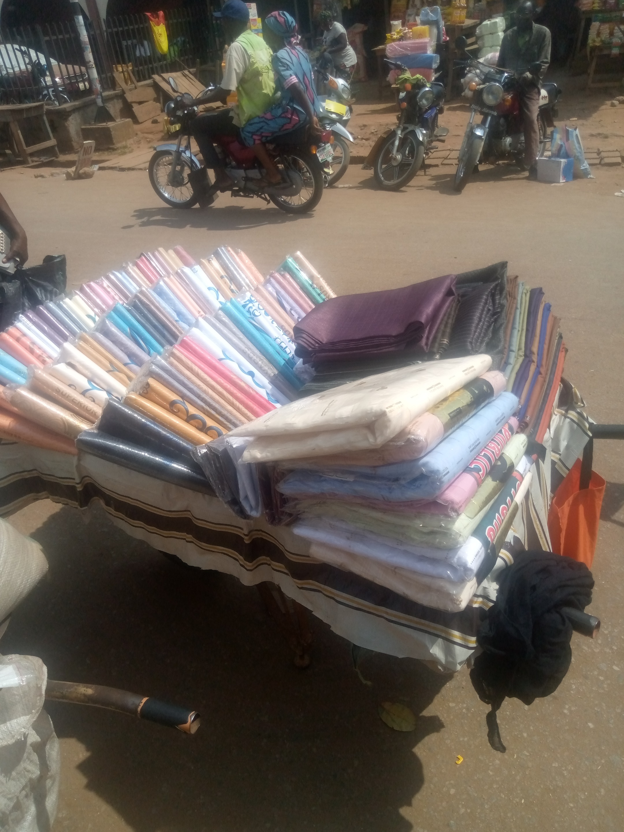 In this spot a particular mallam selling difference kinds of cloth materials. The spot is inside the market.