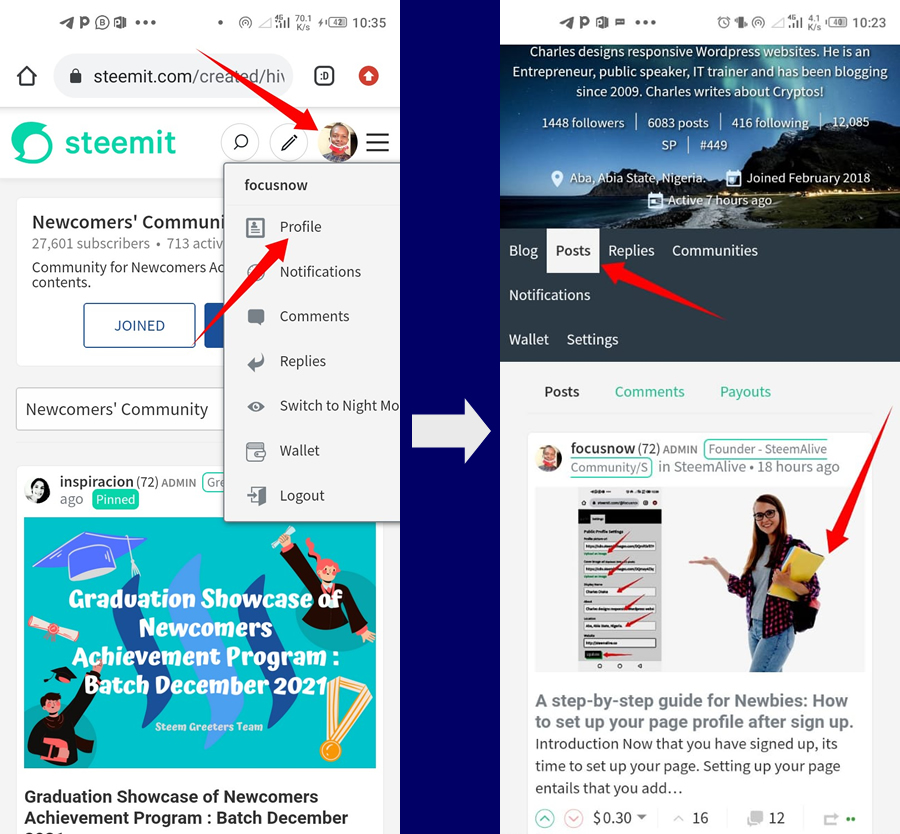Step 2: Click on the Communities tab. You must publish every post in a particular community. Since this is your introduction post, it must be published in Newcomers Community. So click on Newcomers Community from the communities list. (Check image below)