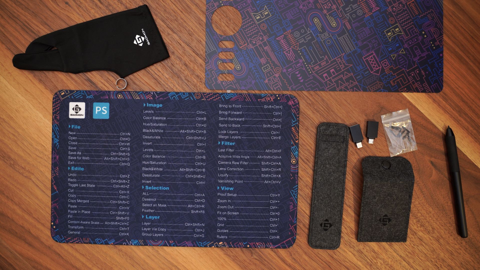 This graphics tablet comes with a lot of accessories. Besides the tablet and the pen, you get a mouse pad, two USB adapters, a glove, extra tips for the pen, an adhesive foil, and a sleeve for transport. There are two small extra cloth bags for the additional tips and the pen. The included USB adapters are a MicroUSB to USB-A Female adapter and a Type C to USB-A Female adapter. Through these adapters, it is possible to plug the tablet to an Android smartphone or tablet, or directly into laptops which only have USB C ports. Very handy. The rather large mouse pad has a lot of Photoshop shortcuts printed on it, which I found quite nice.