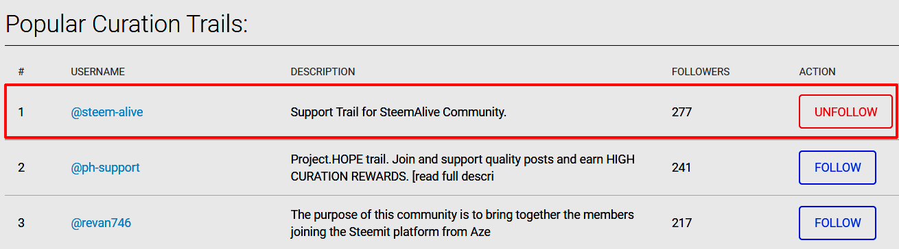 - Community Trail: We vote member posts with our curation trail she now has more followers than any other community trail. Our trail currently have 277 followers and votes with $3.4 - $4.2 at 100 percent weight.
