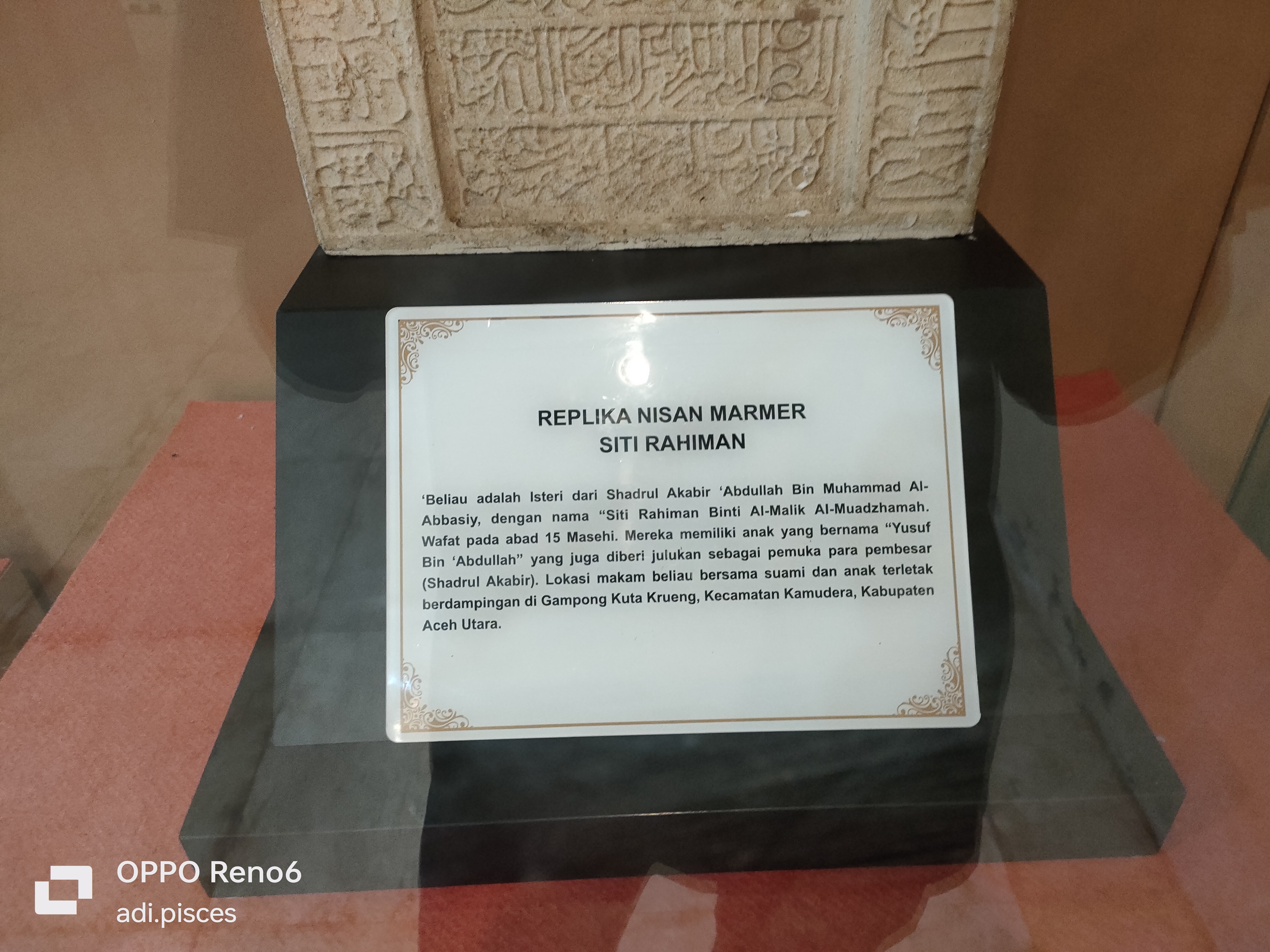 Dan selanjutnya saya melihat berbagai Replika batu nisan marmer, seperti salah satunya, Replika nisan marmer Siti Rahimah : Beliau adalah istri dari shadrul akabir `abdullah bin Muhammad al-abbasiy, lokasi makam beliau bersama suami dan anak terletak berdampingan di Gampoeng Kuta krueng, kecamatan samudra, kabupaten Aceh Utara