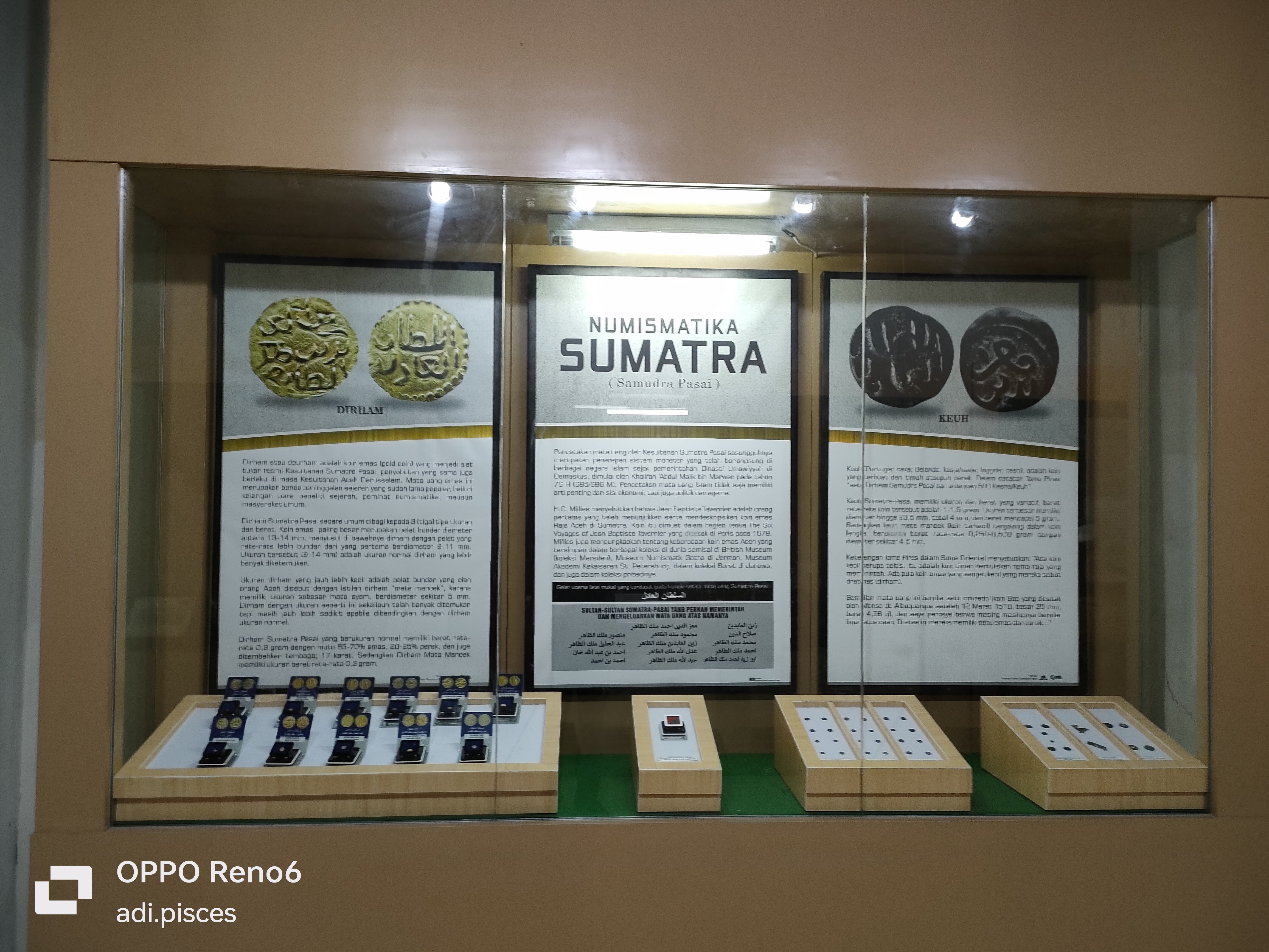 Dan selanjutnya saya menuju ke koleksi mata uang di masa kesultanan Aceh Darussalam yaitu mata uang dirham yang terbuat dari emas murni dan mata uang KEUH dengan berbagai ukuran dan penuh sejarah, disampingnya terdapat berbagai barang peninggalan seperti mangkok dan undangan pada masa itu, dan juga terdapat berbagai jenis perhiasan, seperti kalung anting dan sebagiannya