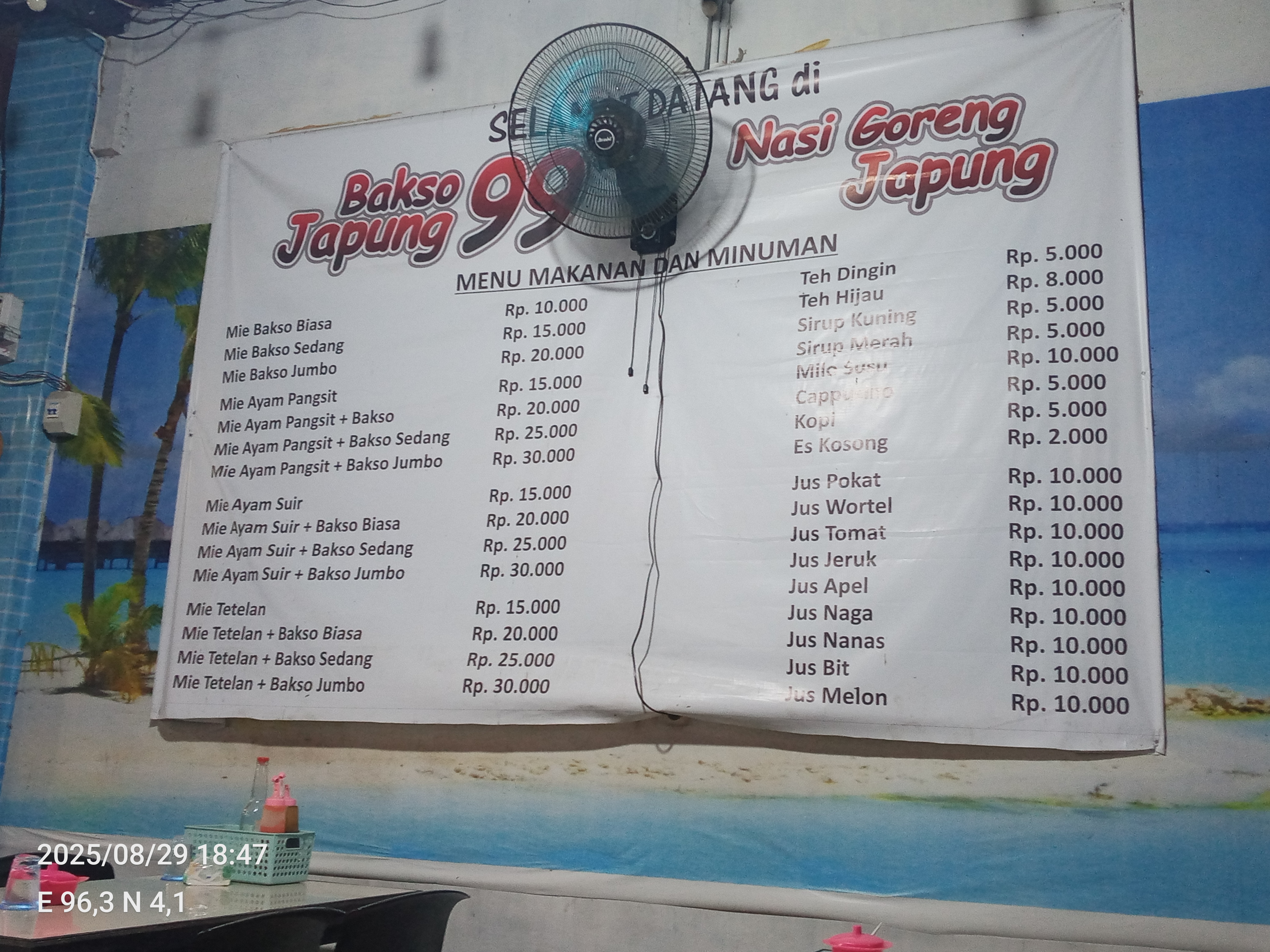 Beberapa menu yang telah disediakan di restoran ini telah di pasang pada dinding agar para pengunjung dapat melihat langsung dengan jelas menu yang mereka inginkan, restoran Japung 99 lebih menyediakan berbagai bakso dan beberapa minuman.