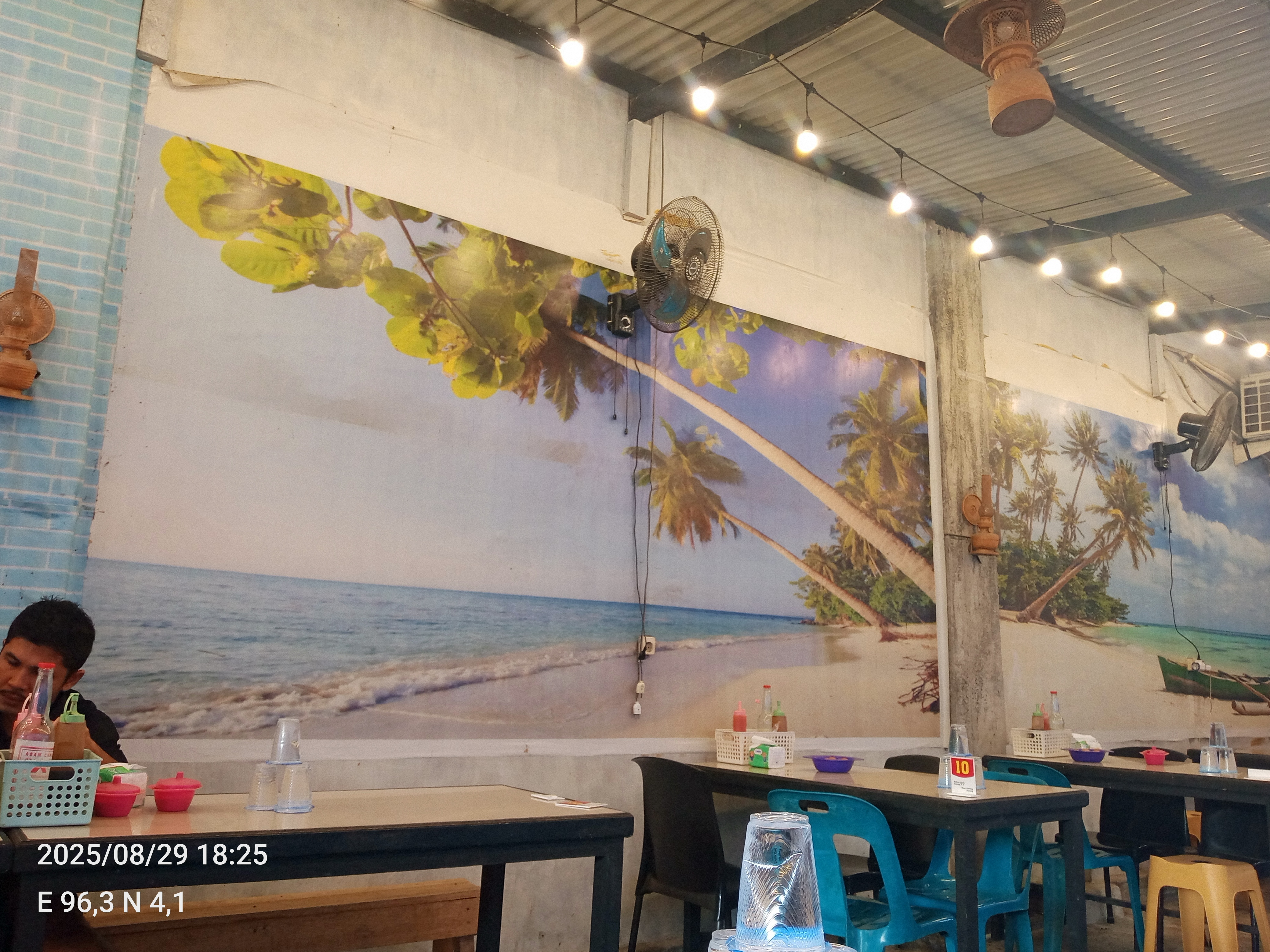 Pemandangan pantai dengan pohon kelapa di pasang pada dinding agar lebih menarik, lampu penerang dinyalakan pada malam hari untuk menerangi ruangan.