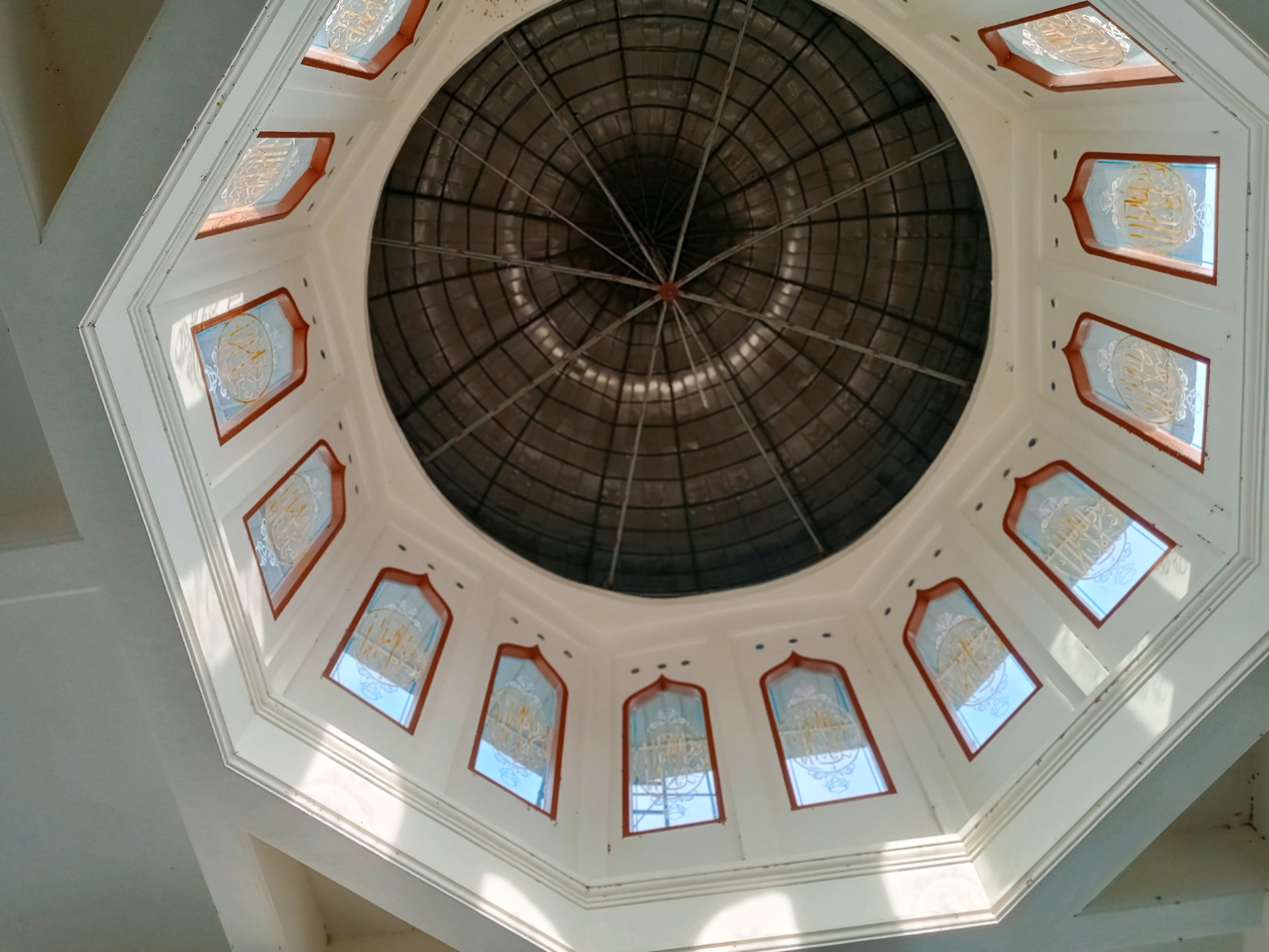 The inside of the dome of the Madinatul Abrar Mosque is also black, surrounded by glass windows that illuminate the dome during the day. On the dome windows there are several names of the Almighty and Holy Allah.
