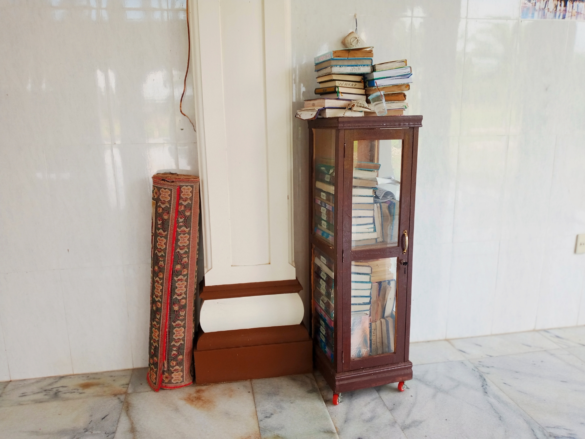 The holy book of the Qur'an is neatly arranged in a cupboard and provides comfort for the congregation and makes it easy for them to take and read it while worshipping.