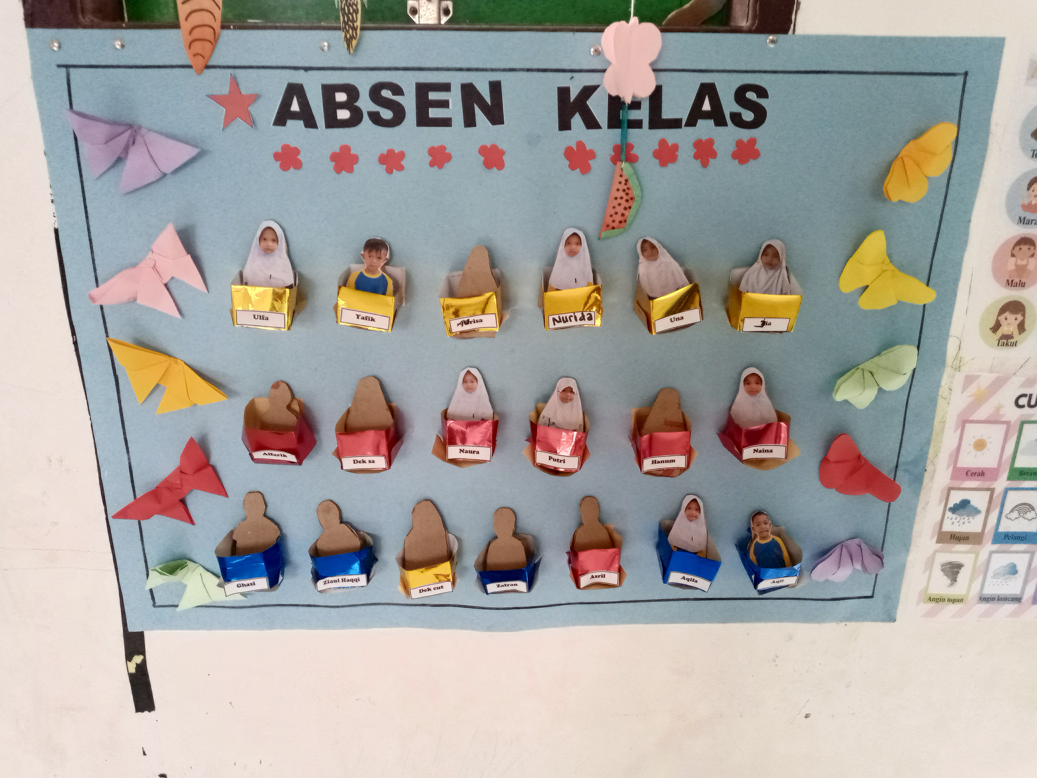 absen kelas berada pada bagian samping pintu masuk dengan mengunakan kertas dan ide kreatif dari sang guru tersebut, kita bisa melihat beberapa kupu-kupu pada bagian samping pintu dan kotak aben bagi para anak-anak saat memasuki kelas belajar tentunya.
