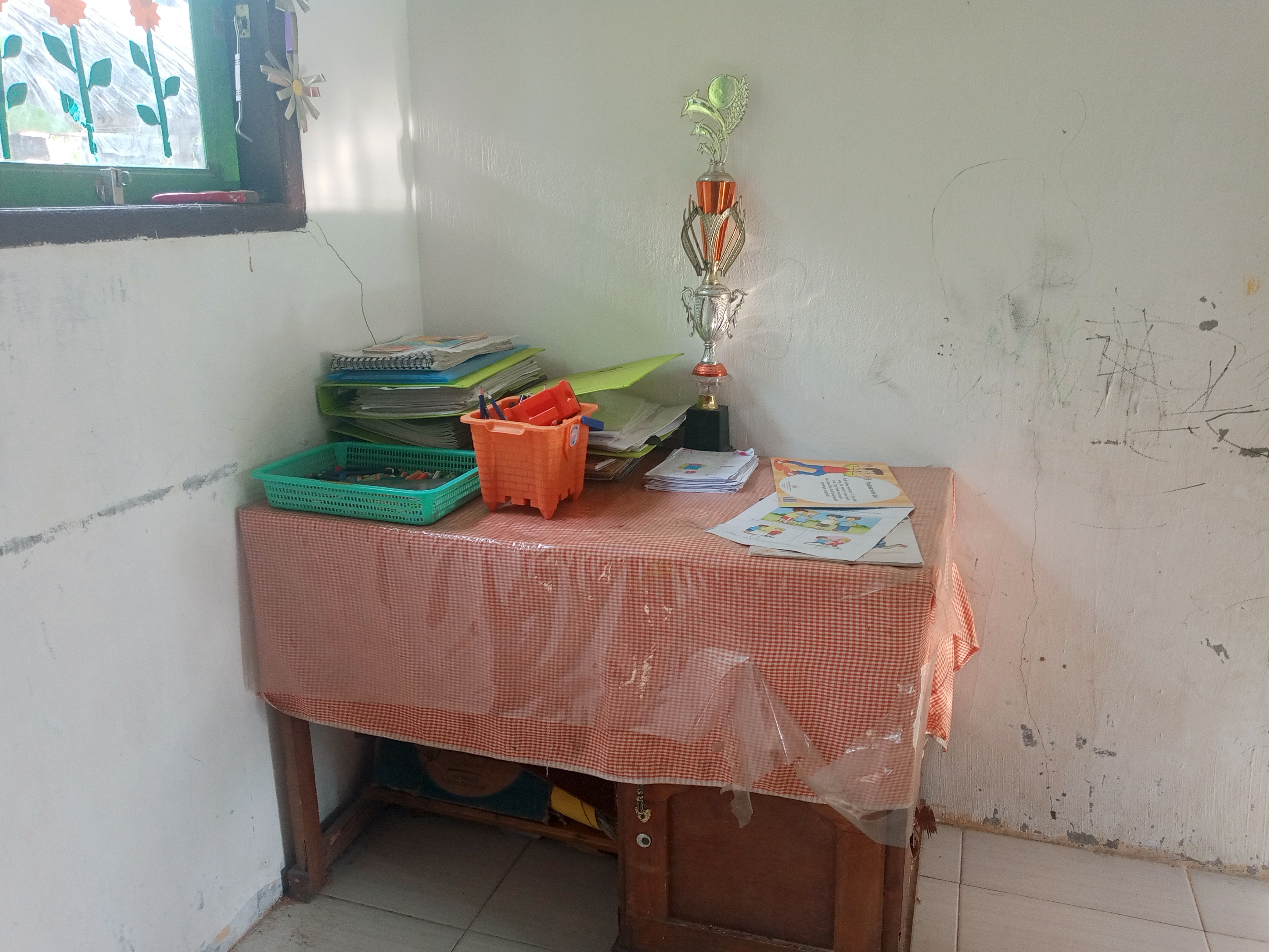Bagian pojok ruangan terdapat sebuah meja guru untuk mengajar dan memberikan keterangan bagi anak-anak tercinta, meja yang seadanya mampu mendidik anak-anak untuk belajar dan menjadi lebih baik.