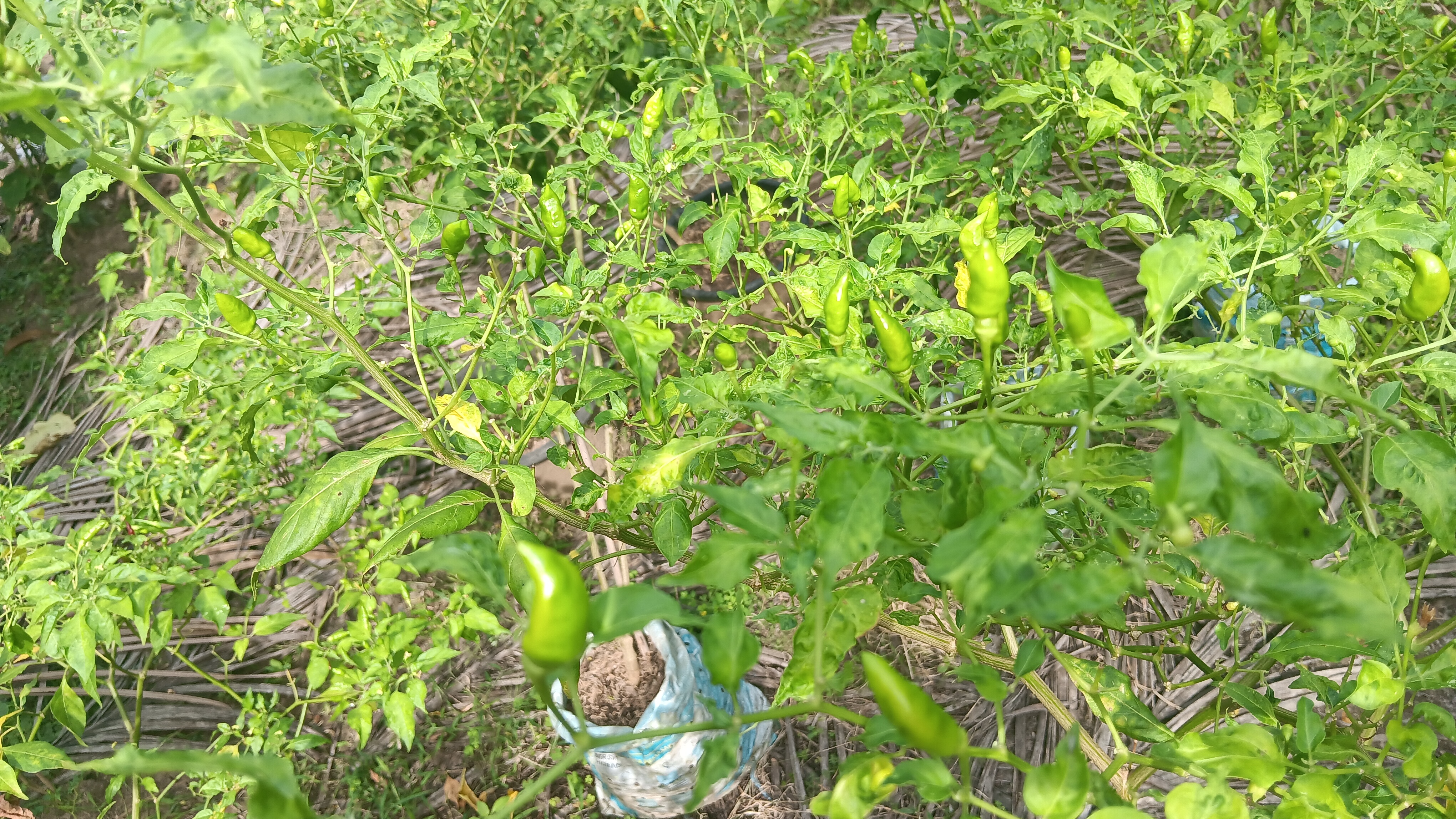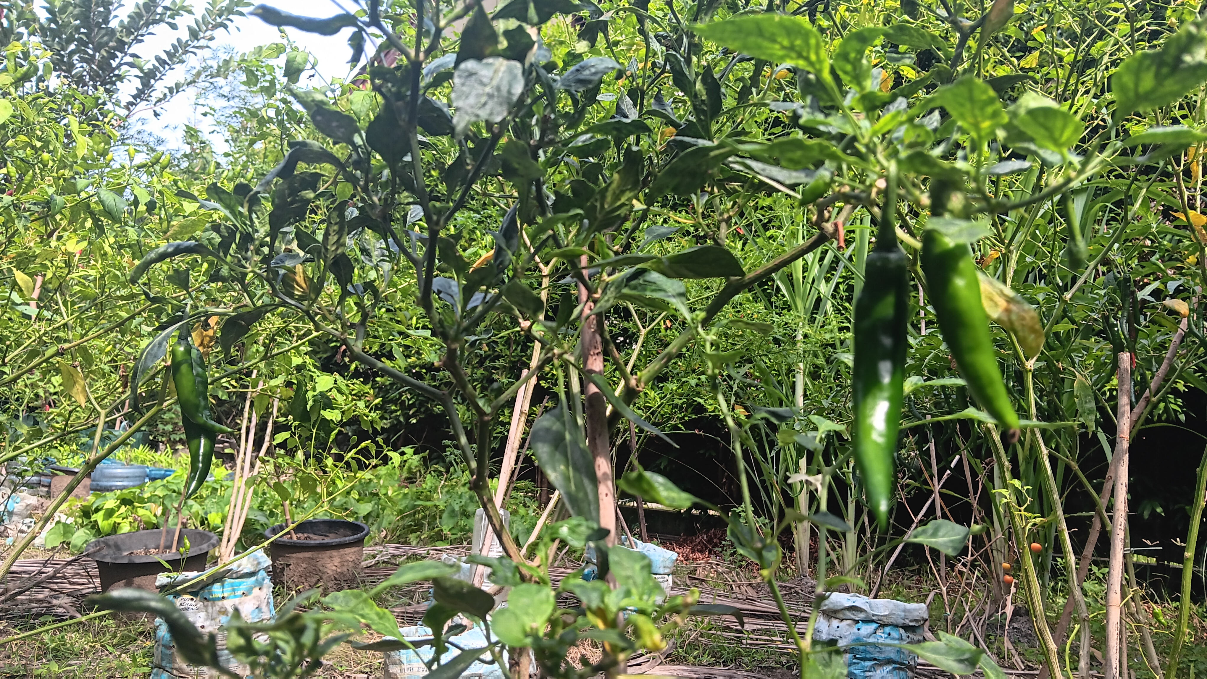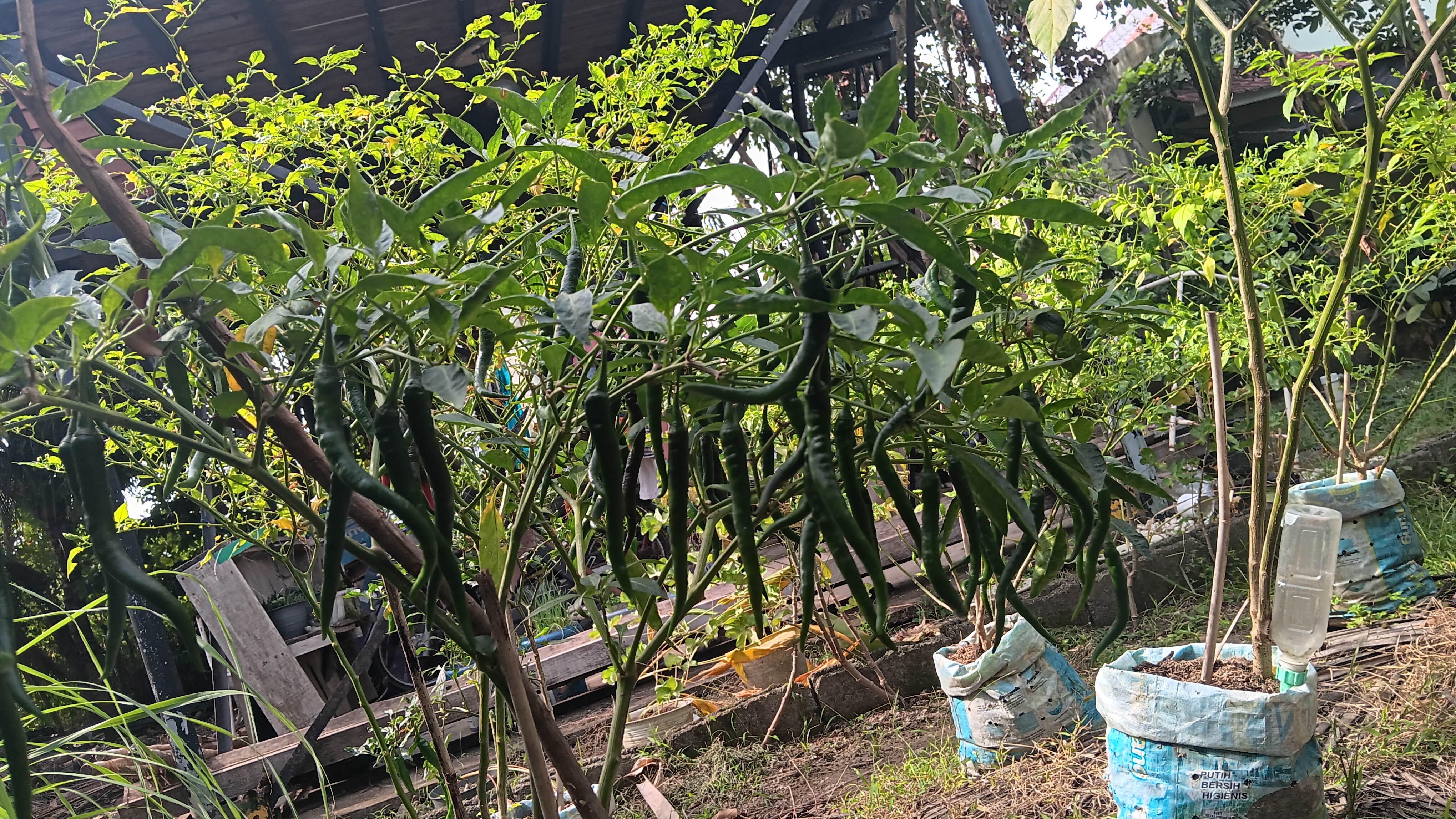 Ada puluhan batang tanaman cabai yang saya tanam dalam karung bekas. Sebagian besar cabai rawit. Saya biasa menyebutnya campli ubiet alias cabe kecil. Karena ini buah terakhir, saya tetap merawatnya dengan baik. Bila tidak sempat menyiram pagi hari, maka sore menjadi saat memberi mereka gizi.