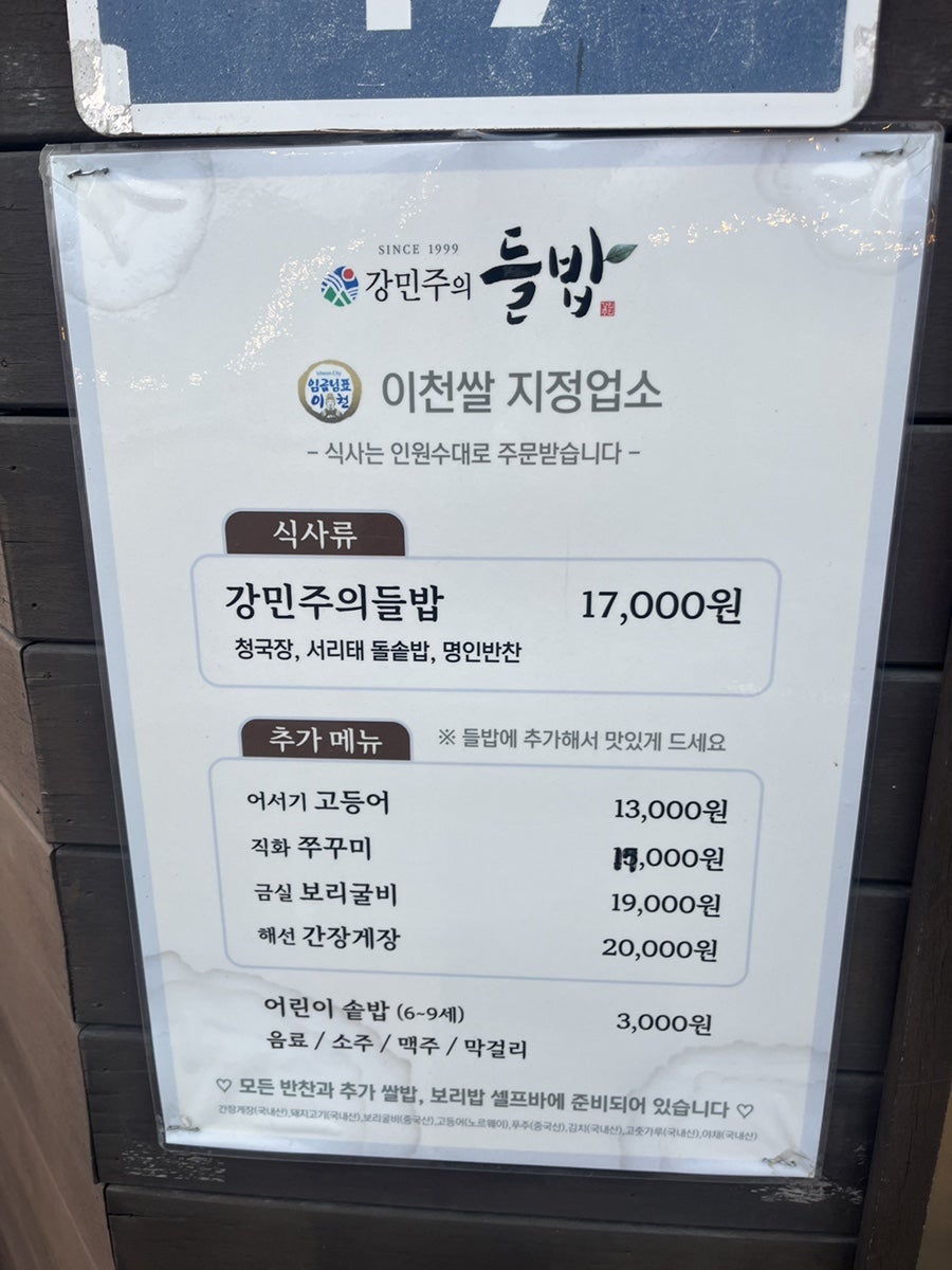 이천 마장면 국도변엔 정갈하고 맛있는 한정식집이 있다. 상호는 "강민주의 들밥"으로, 돌솥밥과 보리굴비가 맛있기로 소문난 곳이다.