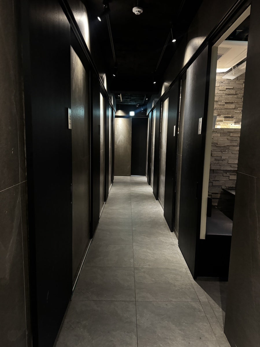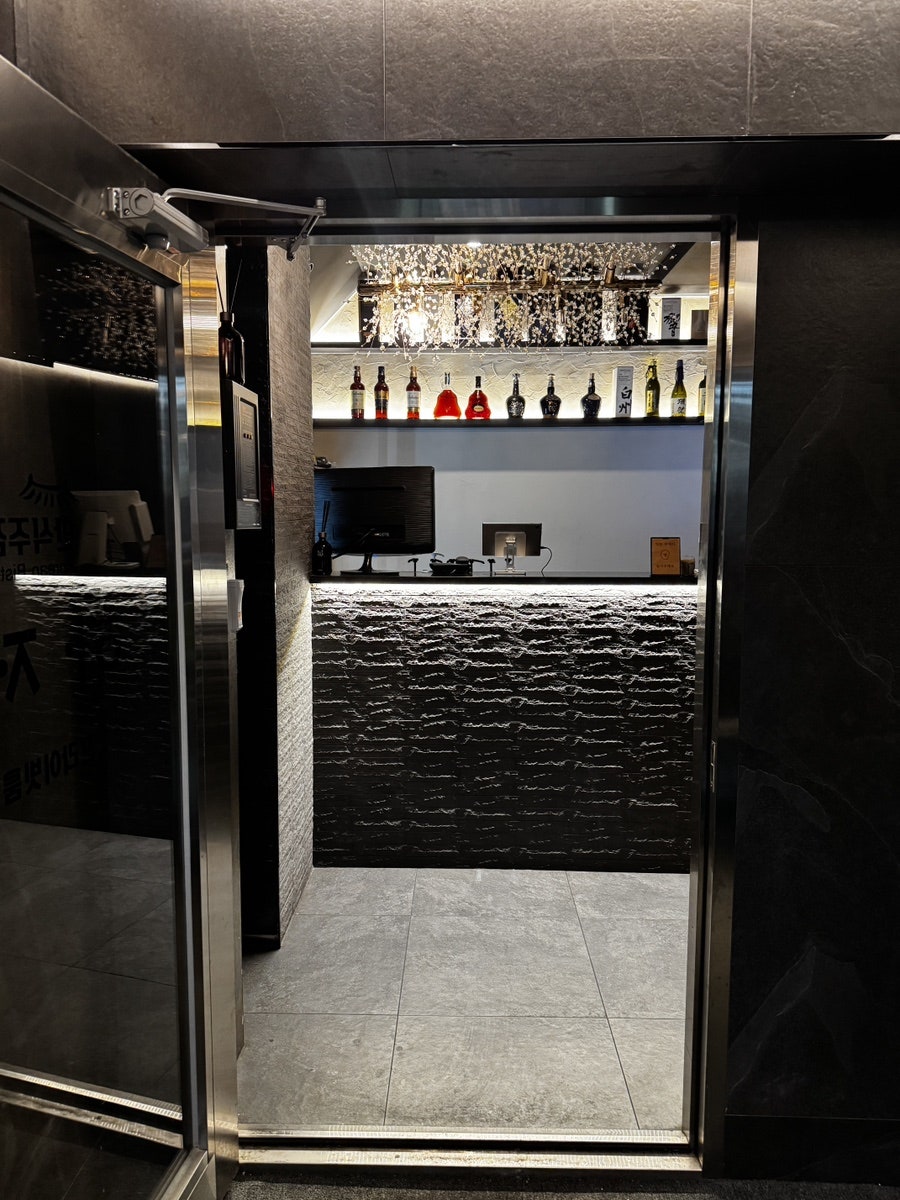 입구부터 블랙톤의 묵직한 인테리어가 인상적이다. 룸 위주로 된 구조로 조용히 대화하기 좋다.