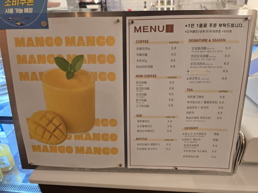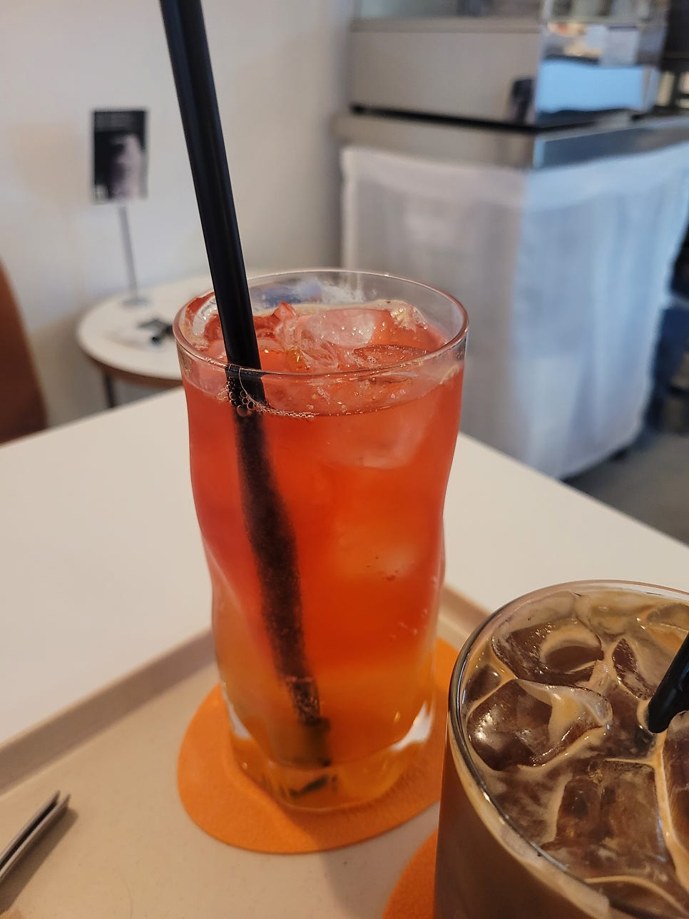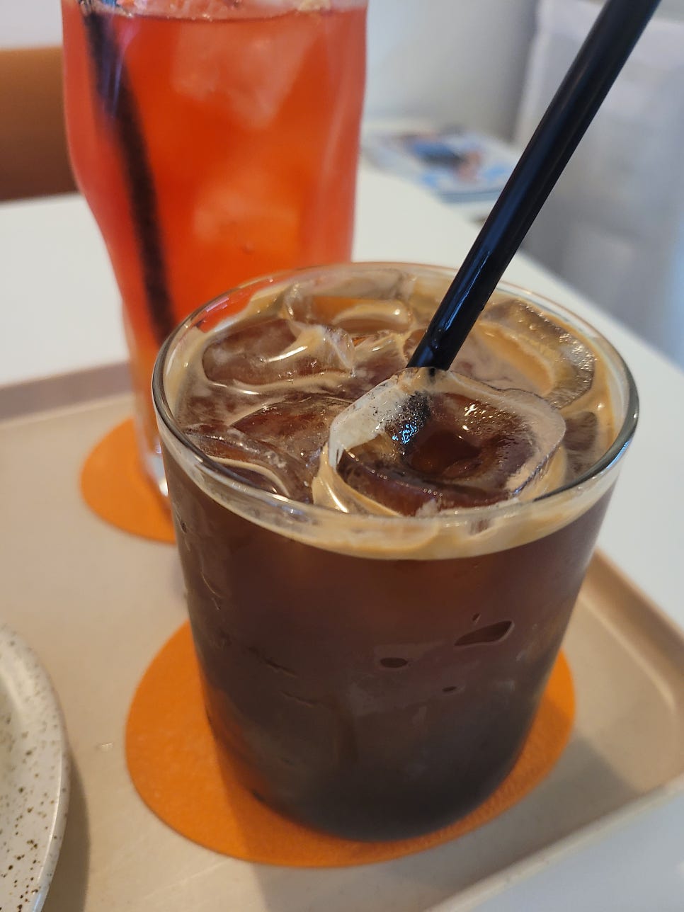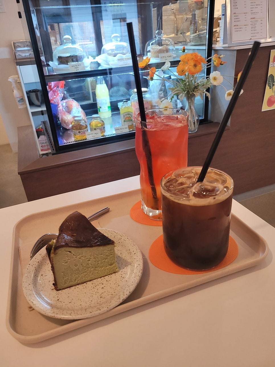 다양한 음료와 더불어 디저트도 유명하다. 패션선셋에이드, 아아, 바스크치즈케잌을 주문!
