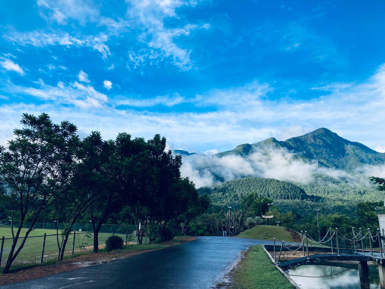 I took these photos using my phone while I was standing near the playground of the university. The environment was so peaceful and beautiful that I did not want to leave it behind. The mountain was towering in the background, covered with green leaves and white fog floating above its peaks. The sky was an electric blue with white clouds, adding an ethereal beauty to the scene.
