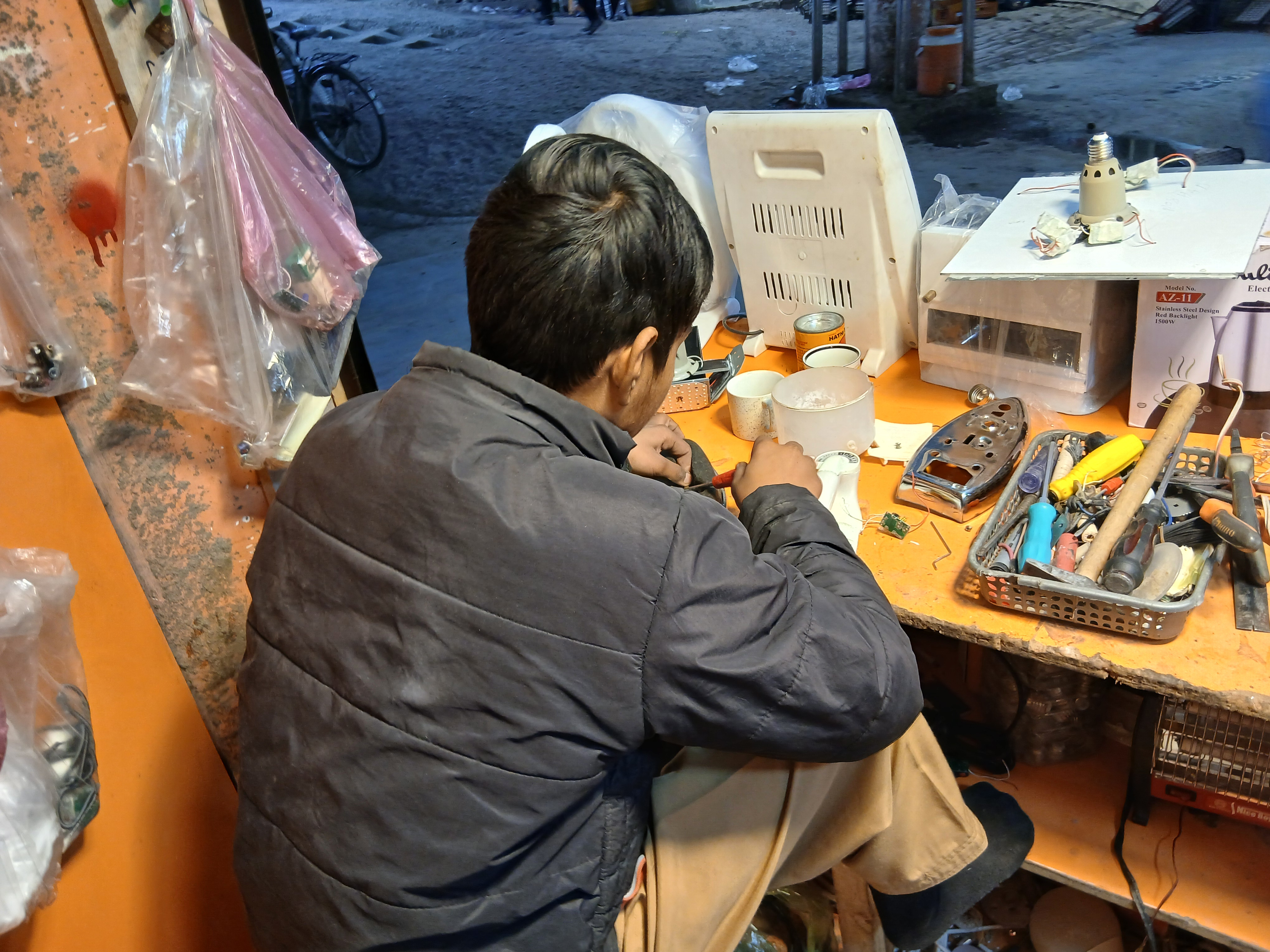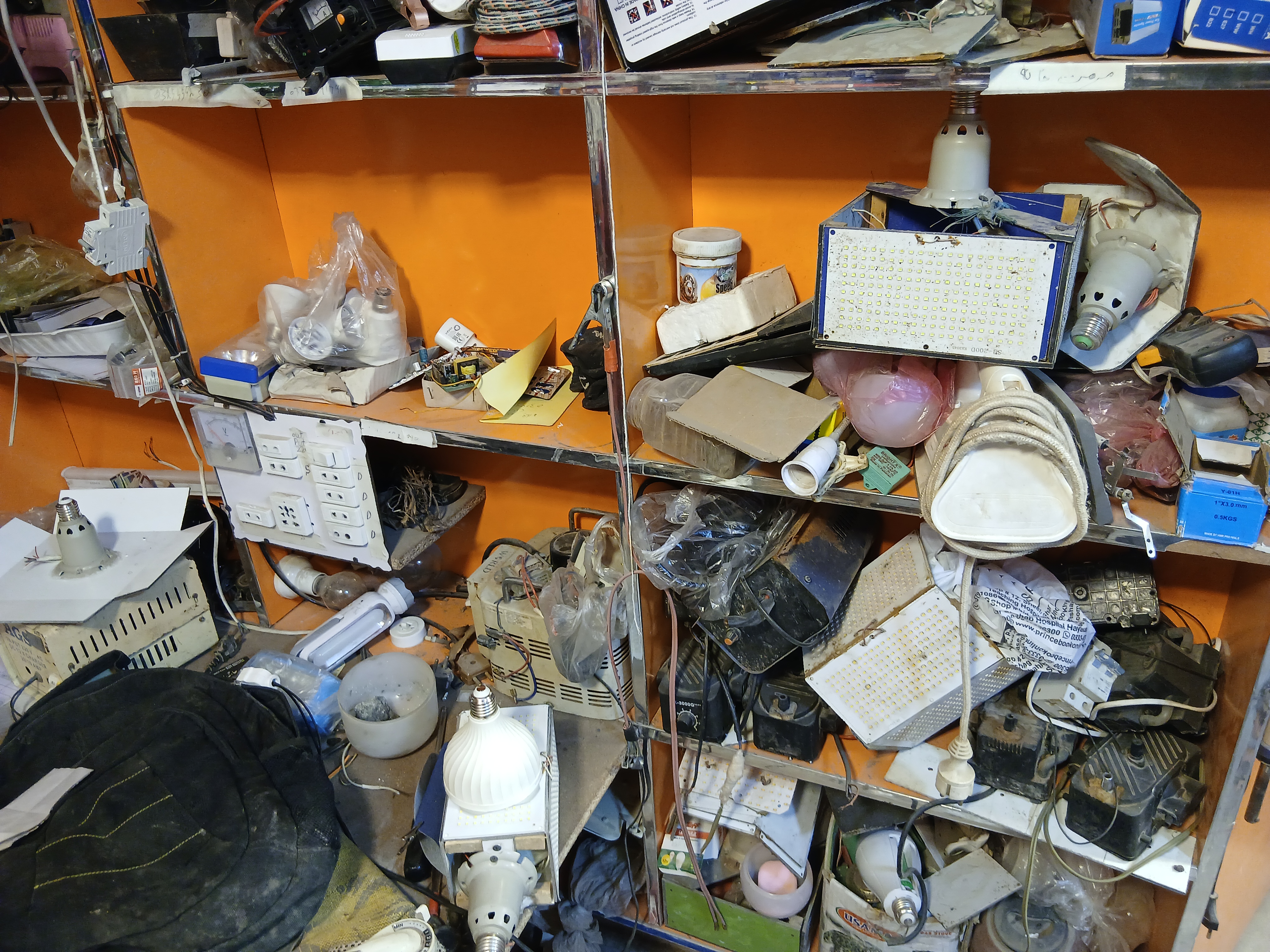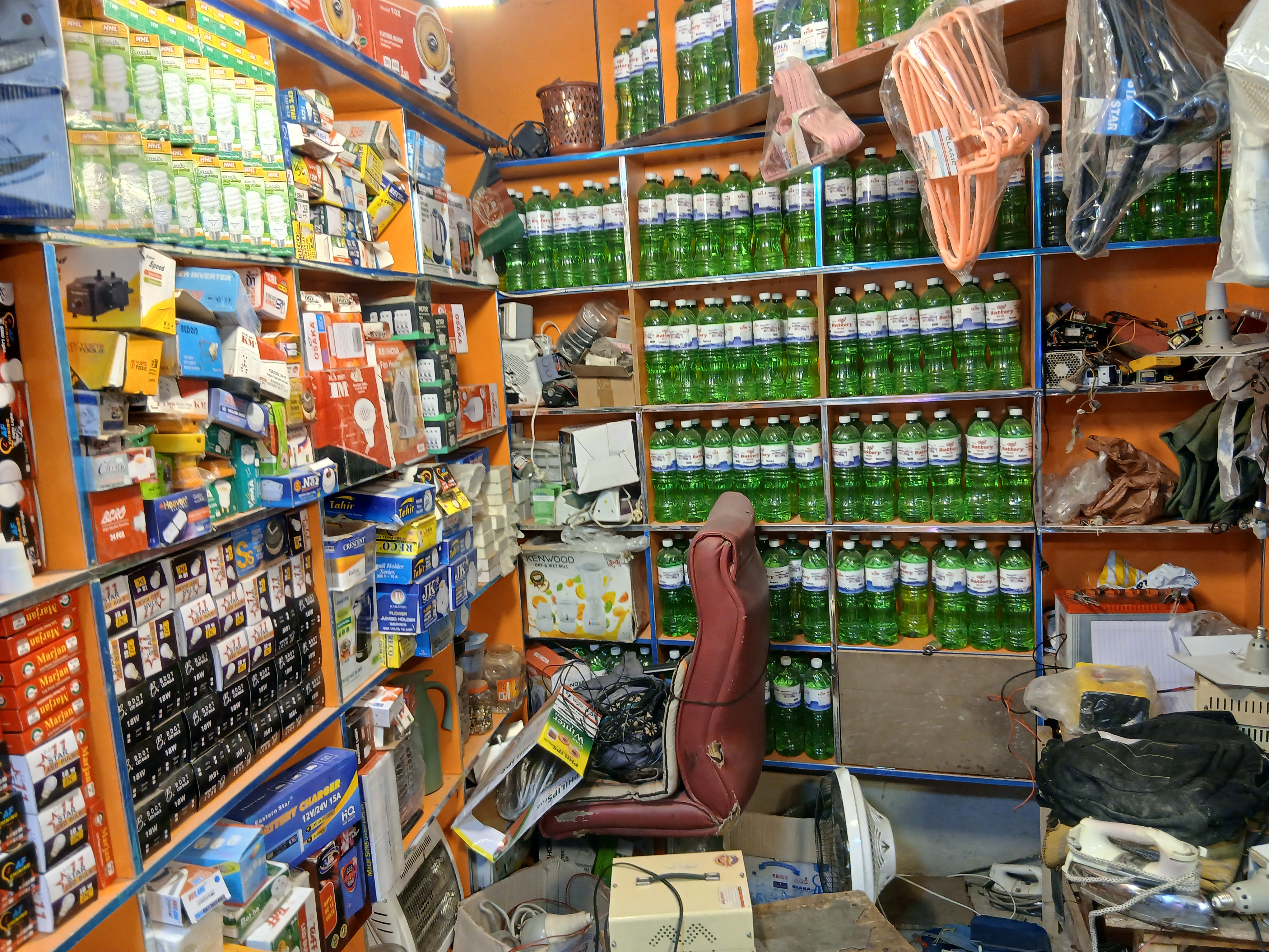 From my photos you can see that the shop is small but very busy and fully equipped. The walls and shelves are filled with fans motors wires switches chargers power supplies iron boxes and spare part