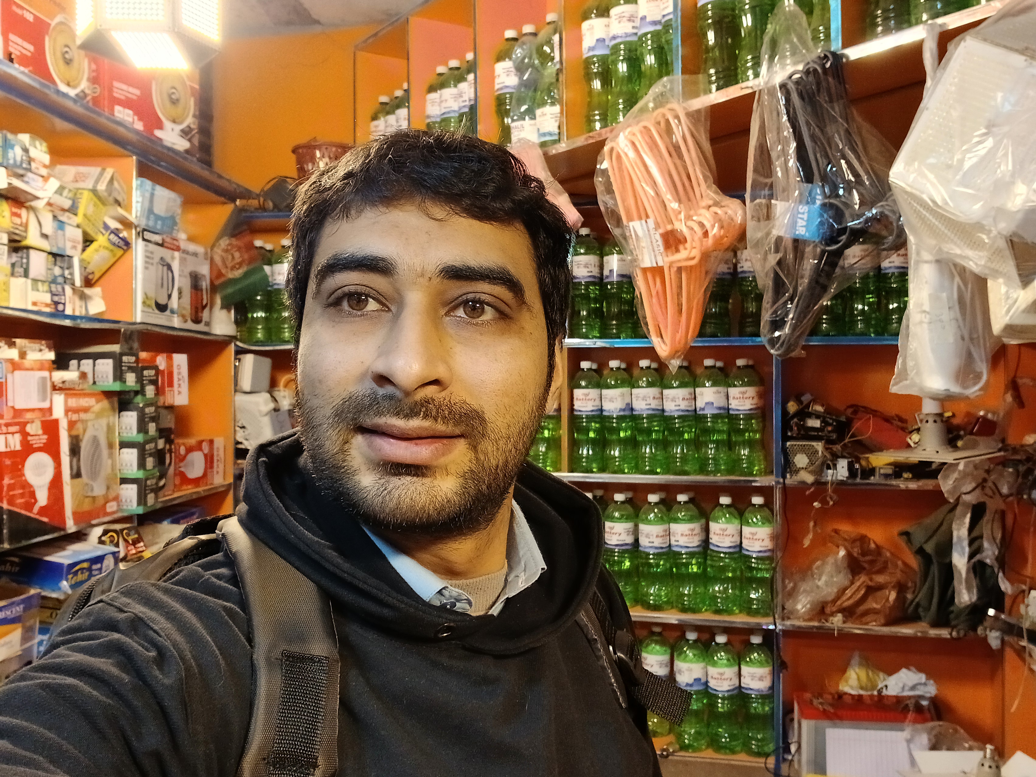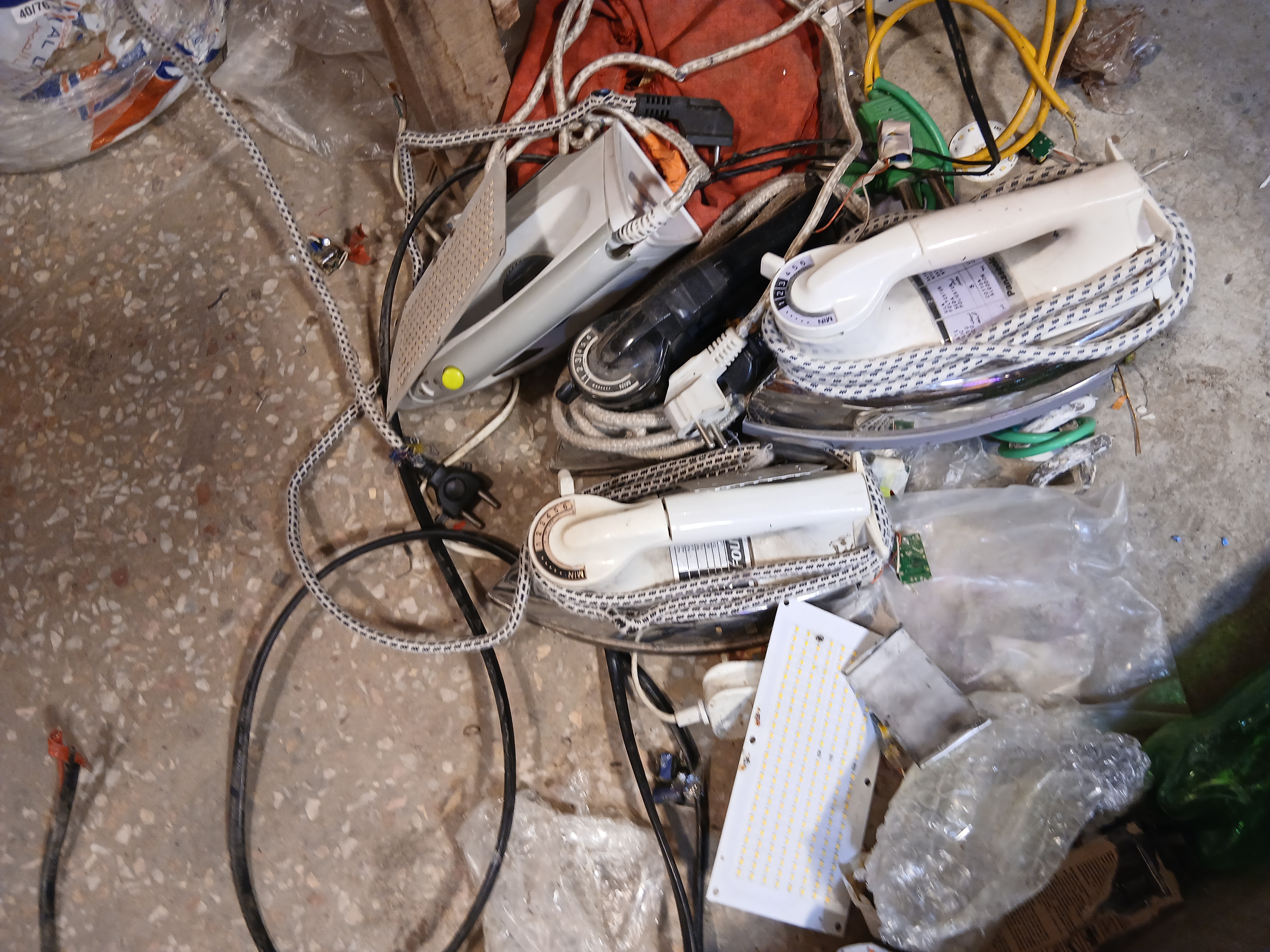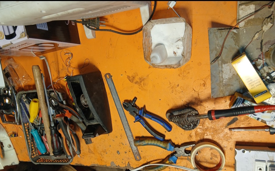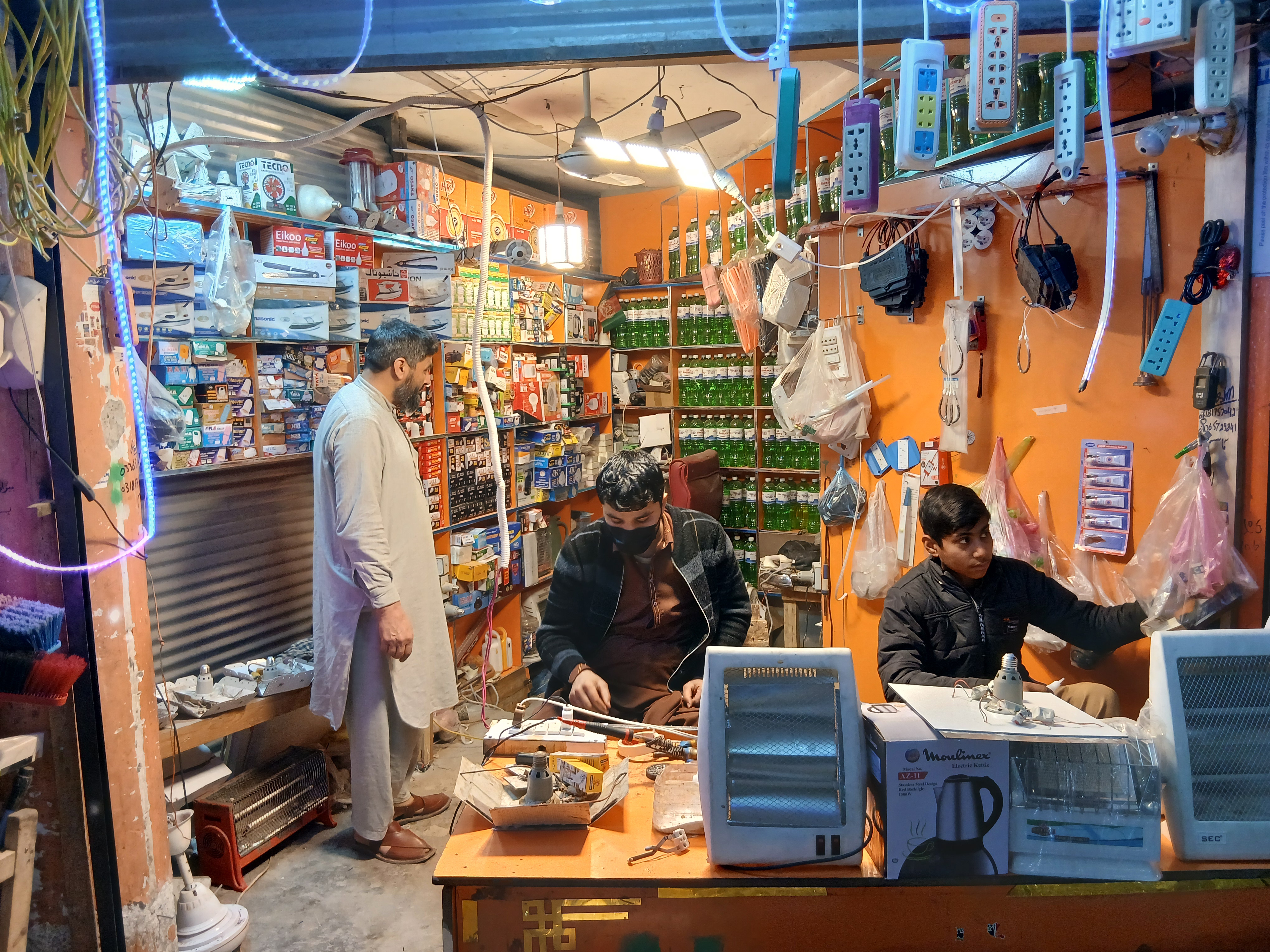 From my photos you can see that the shop is small but very busy and fully equipped. The walls and shelves are filled with fans motors wires switches chargers power supplies iron boxes and spare part