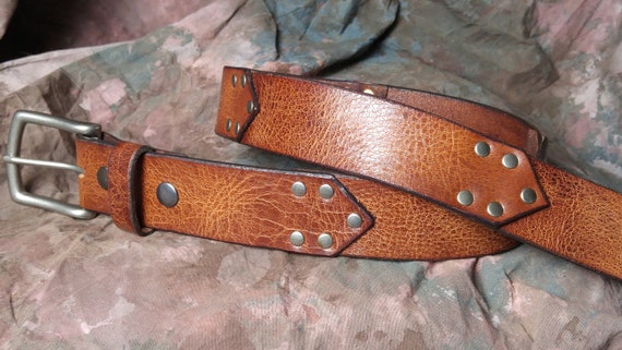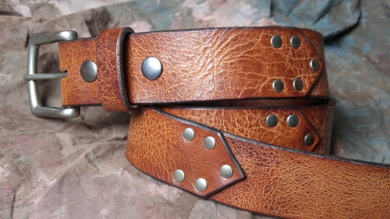 Made from 6 distressed finish pieces of beautiful 9oz water buffalo hide riveted together with antique silver rivets. This belt is soft not stiff, and will wear wonderfully, getting more and more distressed as time goes by.