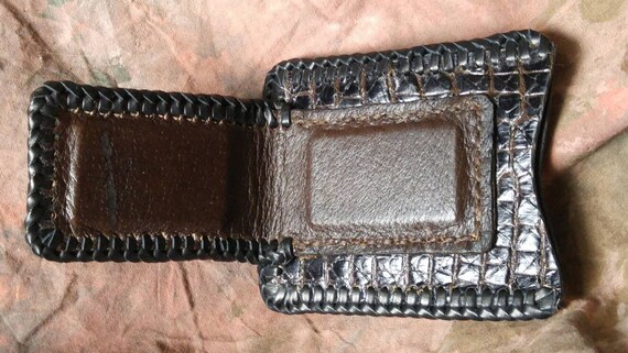 A card wallet with attached magnetic money clip. Carry your cards and your wad of cash all in one neat front pocket package. This one is made of snakeskin with the added bonus of being embossed with a crocodile belly pattern. A really great exotic look without the fabulously high exotic leather price. So it is a faux croc, real snakeskin wallet. Once again...this is real snakeskin that has been run through a crocodile embossing machine to print the texture of croc belly onto it.